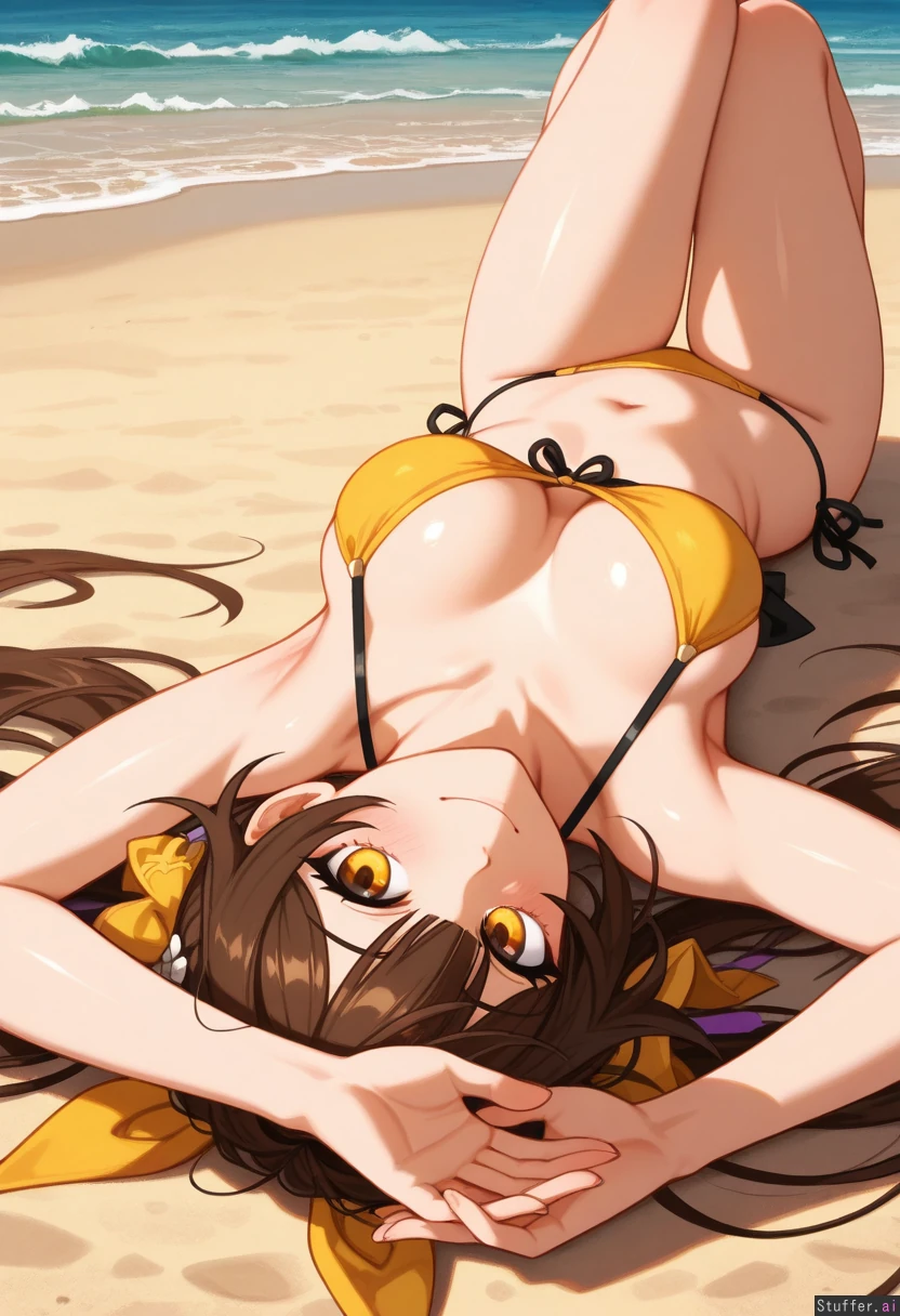 sushang(honkai_star_rail) ,best quality , smooth skin , yellow_eyes, (khyle(artist):0.6) , (masterpiece), (gardegu /(artist/):1.1), (blushyspicy(artist):0.7) , (usa37107692:0.5) ,1girl, solo , petite, smile, beach , laying_down