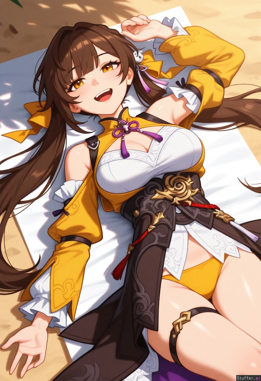 sushang(honkai_star_rail) ,best quality , smooth skin , yellow_eyes, (khyle(artist):0.6) , (masterpiece), (gardegu /(artist/):1.1), (blushyspicy(artist):0.7) , (usa37107692:0.5) ,1girl, solo , petite, smile, beach , laying_down , relaxing , open_mouth , viewed_from_above
