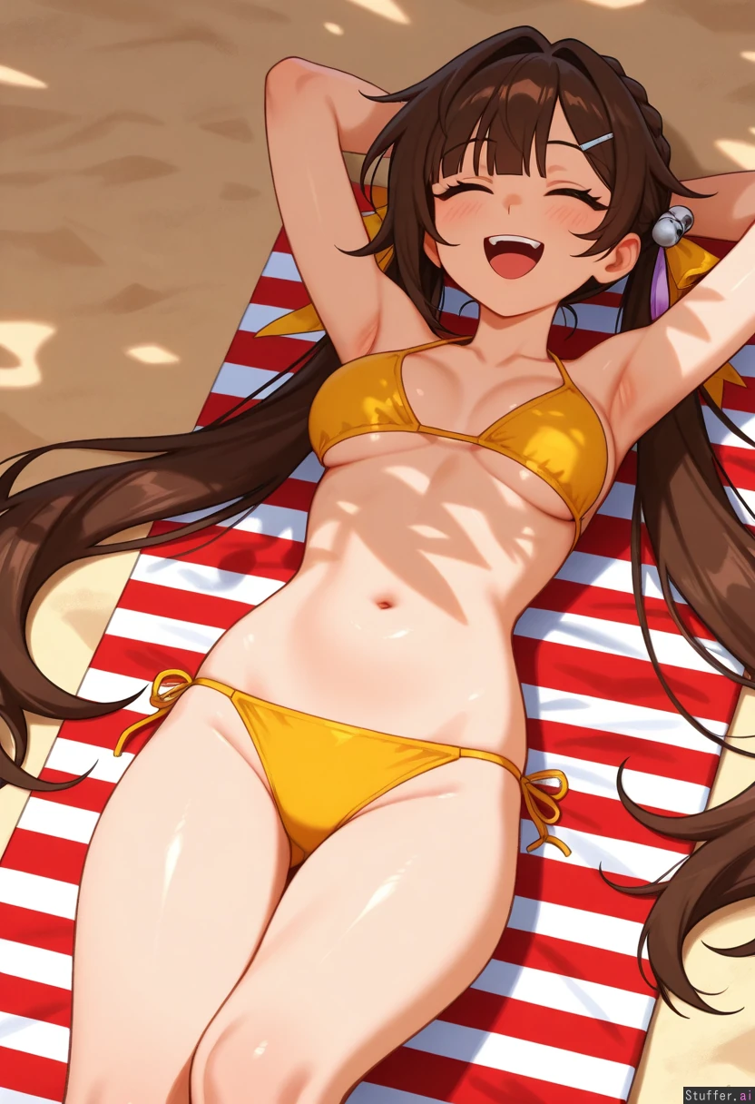 sushang(honkai_star_rail) ,best quality , smooth skin , yellow_eyes, (khyle(artist):0.6) , (masterpiece), (gardegu /(artist/):1.1), (blushyspicy(artist):0.7) , (usa37107692:0.5) ,1girl, solo , petite, smile, beach , laying_down , relaxing , open_mouth , viewed_from_above , yellow bikini, closed_eyes , hands_behind_head