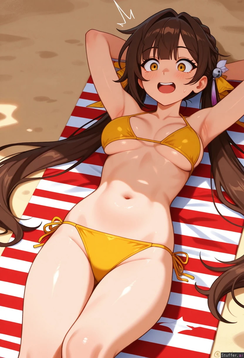 sushang(honkai_star_rail) ,best quality , smooth skin , yellow_eyes, (khyle(artist):0.6) , (masterpiece), (gardegu /(artist/):1.1), (blushyspicy(artist):0.7) , (usa37107692:0.5) ,1girl, solo , petite, smile, beach , laying_down , relaxing , open_mouth , viewed_from_above , yellow bikini, hands_behind_head , (breast_expansion:0.0) , surprised , looking_down