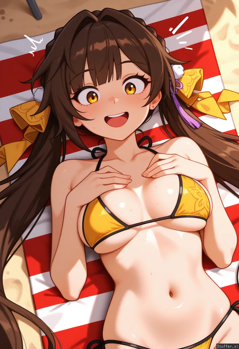sushang(honkai_star_rail) ,best quality , smooth skin , yellow_eyes, (khyle(artist):0.6) , (masterpiece), (gardegu /(artist/):1.1), (blushyspicy(artist):0.7) , (usa37107692:0.5) ,1girl, solo , petite, smile, beach , laying_down , relaxing , open_mouth , viewed_from_above , yellow bikini, (breast_expansion:1.1) , surprised , looking_down , hand_on_breast