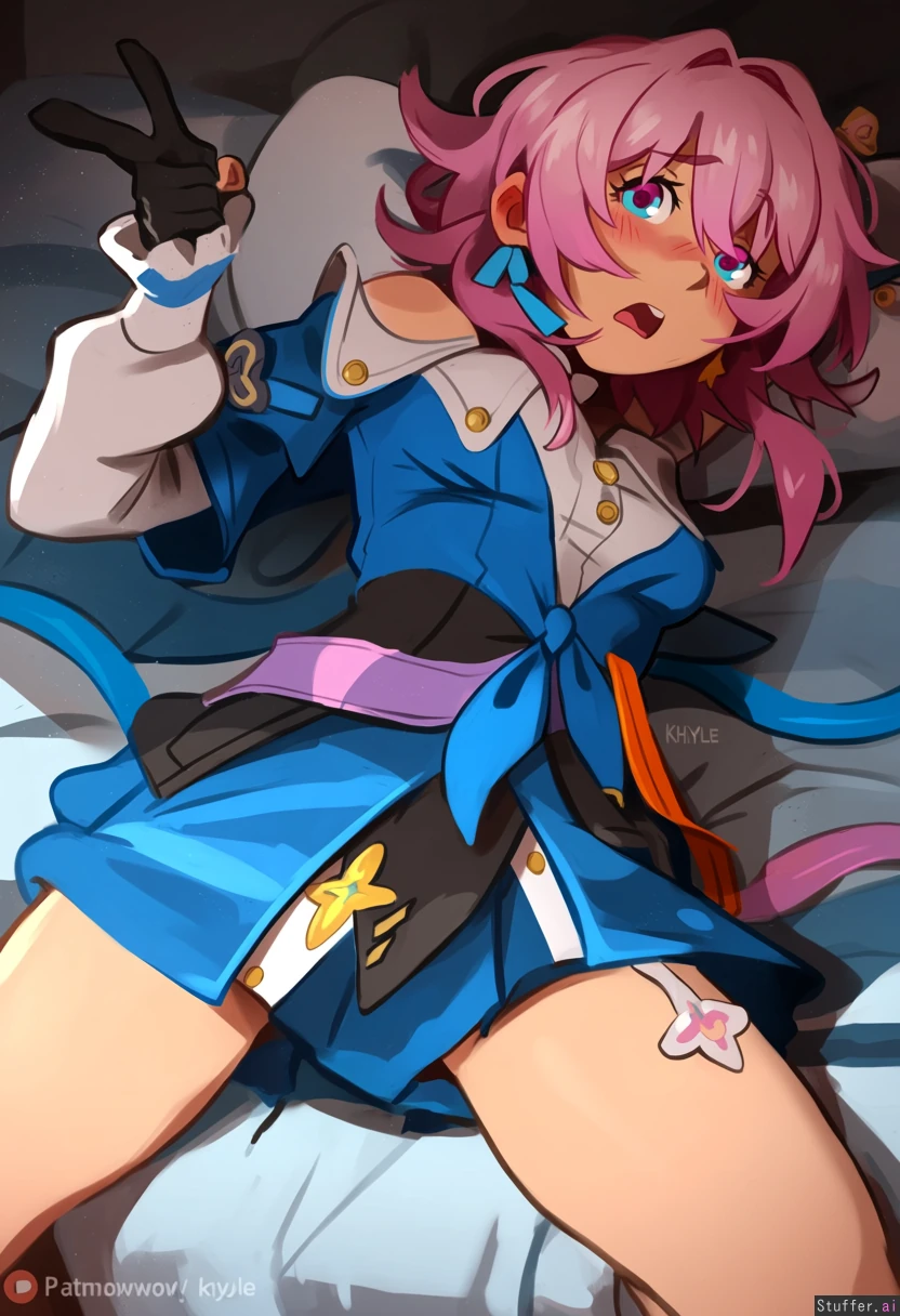 multiple_characters , stelle (from honkai star rail), March7th(from honkai star rail), posing , @khyle , bed, laying_down