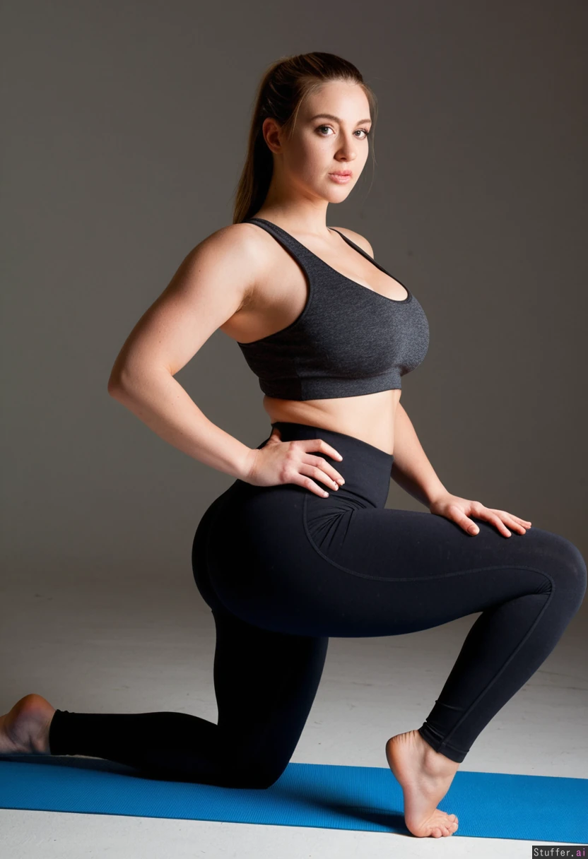 beautiful caucasian woman, wearing sports bra, tight yoga pants, photoshoot, studio lighting, ultra realistic, 8k, photorealistic, curvy body