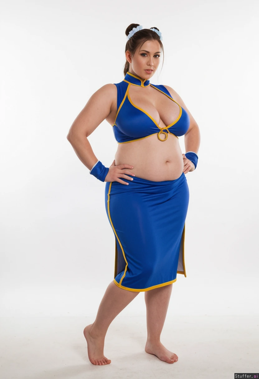 beautiful caucasian woman, wearing chun-li costume, photoshoot, studio lighting, ultra realistic, 8k, photorealistic, curvy body, standing, full body, mombod, front view, gained weight, unfit, round belly