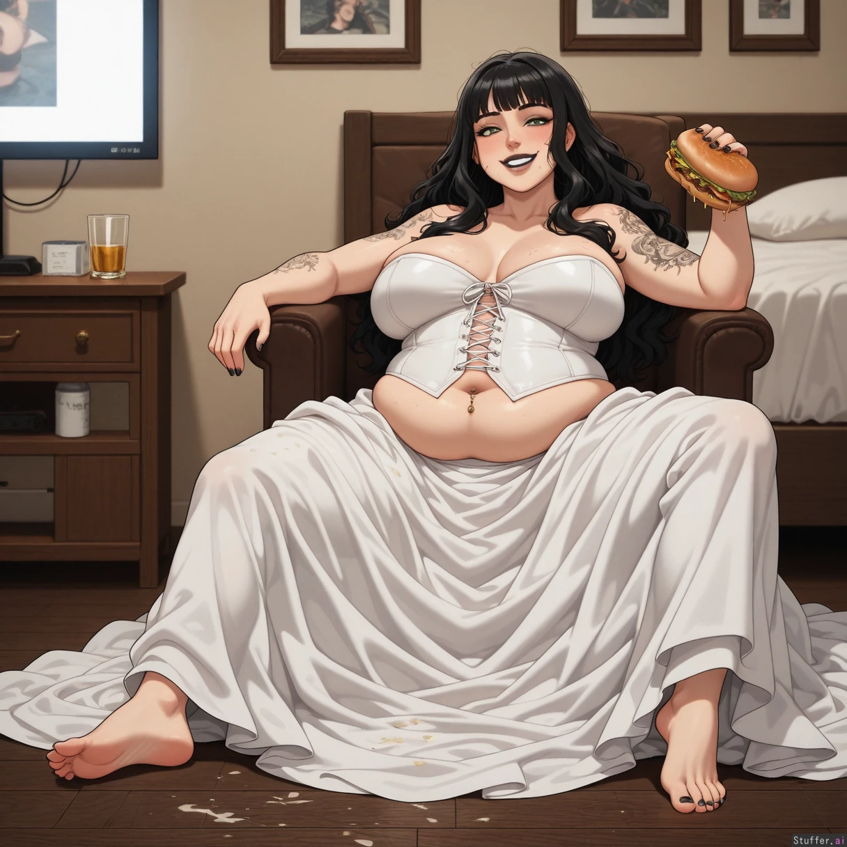 Solo 1girl, black lipstick, bangs, FURANH_(artist), (black long wavy hair, bangs)and arm tattoos, belly button piercing, extremely messy bedroom, stained wedding dress, black nails, tight corset, realistic, smile, wife, gaining weight since wedding, green eyes, feminine feet, feminine hands, food stains, messy, Watching tv lazyly, eating greasy cheeseburger, sitting on chair, alcohol binge, drunk, hungry, massive potbelly, chubby, bulging belly, big love handles, feet spread out, fat tighs, feet on ground,