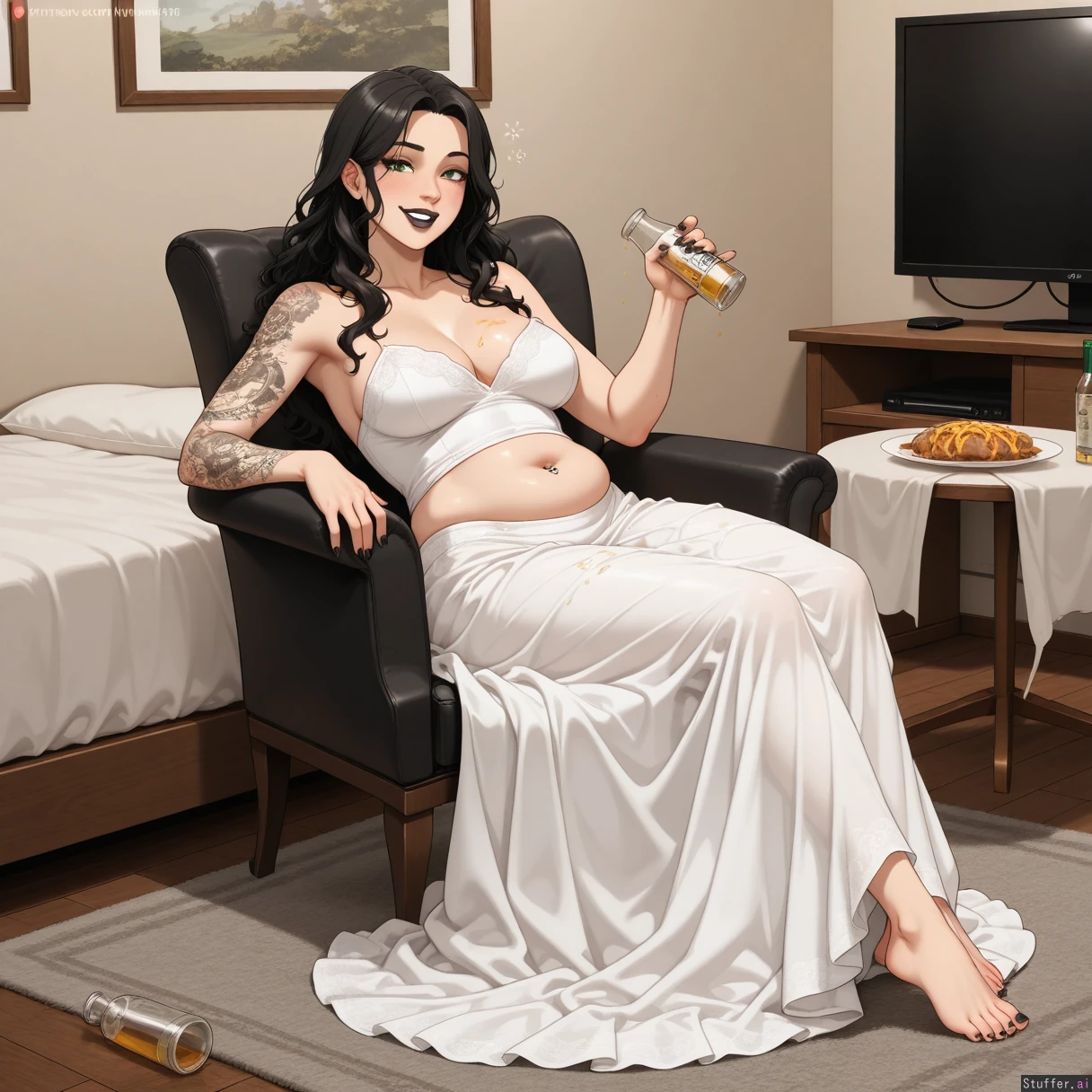 Solo 1girl, black lipstick, bangs, FURANH_(artist), (black long wavy hair, bangs)and arm tattoos, belly button piercing, extremely messy bedroom, stained wedding dress, black nails, realistic, smile, wife, gaining weight since wedding, green eyes, feminine feet, feminine hands, food stains, messy, Watching tv lazyly, eating greasy cheeseburger, sitting on chair, alcohol binge, drunk, hungry,