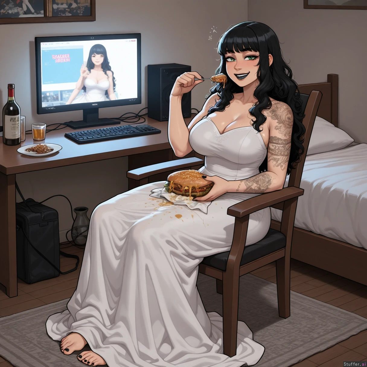 Solo 1girl, black lipstick, bangs, FURANH_(artist), krekkov (artist), (black long wavy hair, bangs)and arm tattoos, extremely messy bedroom, stained wedding dress, black nails, realistic, smile, wife, gaining weight since wedding, green eyes, feminine feet, feminine hands, food stains, messy, Watching tv lazyly, eating greasy cheeseburger, sitting on chair, alcohol binge, drunk, hungry,