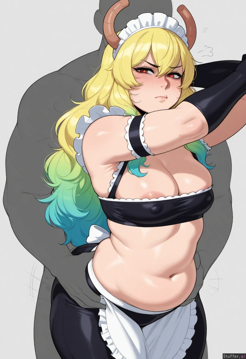(Krekkov (artist), KAMII MOMORU(artist), KipTeiTei(artist), Vale-City(artist)), beautiful shading, highly detailed, best quality, perfect anatomy, perfect proportions, perfect lighting, solo, Lucoa_maid_dragon, Chubby arms, chubby face, (Frustrated:1.6), Hands lifting ass cheeks, rear view, nipple outline, soft belly, belly rolls, cleavage, (Layer of fat around belly: 0.0), (Narrow waist: 0.0), (narrow hips: 0.0), (1flatchest), (Bloated: 0.0), (Big belly: 0.0), (Fat rolls: 0.0), (Fat legs:0.0) (Fat ass:0.0) ,erect_nipples_under_clothes ,erect_nipples ,nipples_visible_through_clothing, ,looking_at_viewer ((man fondling from behind, man don't have modifiers))