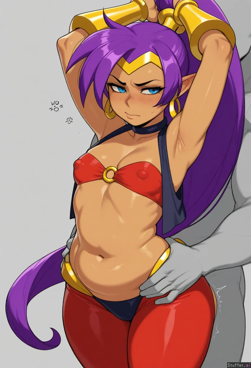 (Krekkov (artist), KAMII MOMORU(artist), KipTeiTei(artist), Vale-City(artist)), beautiful shading, highly detailed, best quality, perfect anatomy, perfect proportions, perfect lighting, solo, Shantae, Chubby arms, chubby face, (Frustrated:1.6), Hands lifting ass cheeks, rear view, nipple outline, soft belly, belly rolls, cleavage, (Layer of fat around belly: 0.0), (Narrow waist: 0.0), (narrow hips: 0.0), (1flatchest), (Bloated: 0.0), (Big belly: 0.0), (Fat rolls: 0.0), (Fat legs:0.0) (Fat ass:0.0) ,erect_nipples_under_clothes ,erect_nipples ,nipples_visible_through_clothing, ,looking_at_viewer ((man fondling from behind, man don't have modifiers))