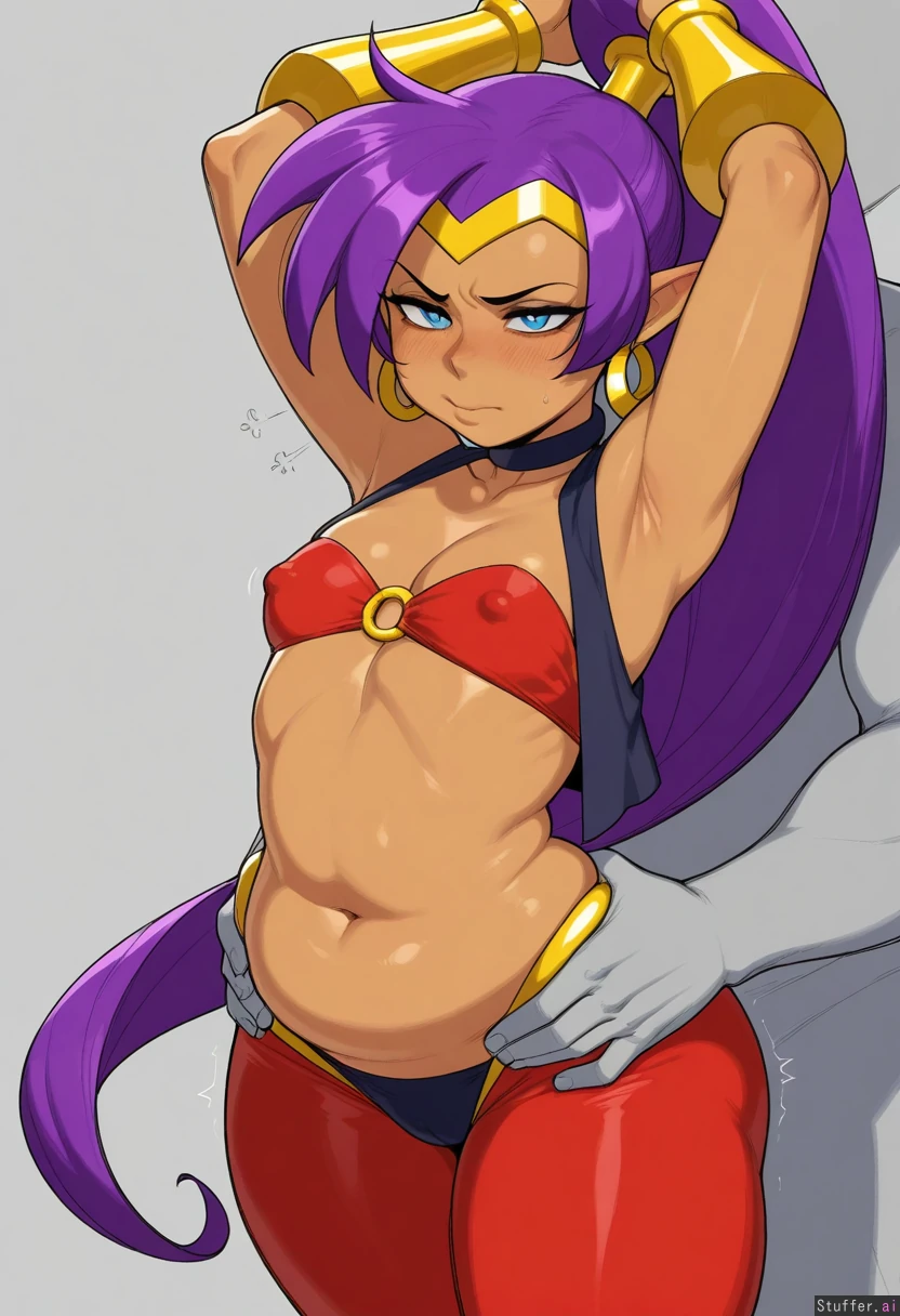 (Krekkov (artist), KAMII MOMORU(artist), KipTeiTei(artist), Vale-City(artist)), beautiful shading, highly detailed, best quality, perfect anatomy, perfect proportions, perfect lighting, solo, Shantae, Chubby arms, chubby face, (Frustrated:1.6), Hands lifting ass cheeks, rear view, nipple outline, soft belly, belly rolls, cleavage, (Layer of fat around belly: 0.76), (Narrow waist: 0.0), (narrow hips: 0.0), (1flatchest), (Bloated: 0.79), (Big belly: 0.74), (Fat rolls: 0.68), (Fat legs:0.0) (Fat ass:0.0) ,erect_nipples_under_clothes ,erect_nipples ,nipples_visible_through_clothing, ,looking_at_viewer ((man fondling from behind, man don't have modifiers))