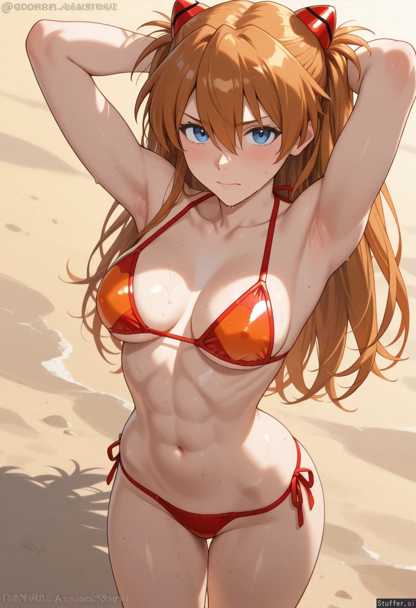 absurdres, 8k, perfect anatomy, masterpiece, beautiful face, beautiful eyes, (((solo, 1girl))), young (((asuka langley sohryu:1.9))), redhead, fit, athletic, abs, muscular_female, sweat, micro_bikini, arms_up, arms_behind_head, teasing, lustful, medium_breasts, oil, oiled, beach, embarrassed, wide_hips, armpit_stubble
