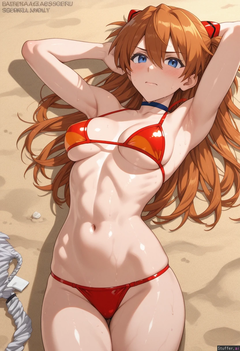 absurdres, 8k, perfect anatomy, masterpiece, beautiful face, beautiful eyes, (((solo, 1girl))), young (((asuka langley sohryu:1.9))), redhead, fit, athletic, abs, muscular_female, sweat, micro_bikini, medium_breasts, oil, oiled, beach, embarrassed, wide_hips, armpit_stubble, middle_finger