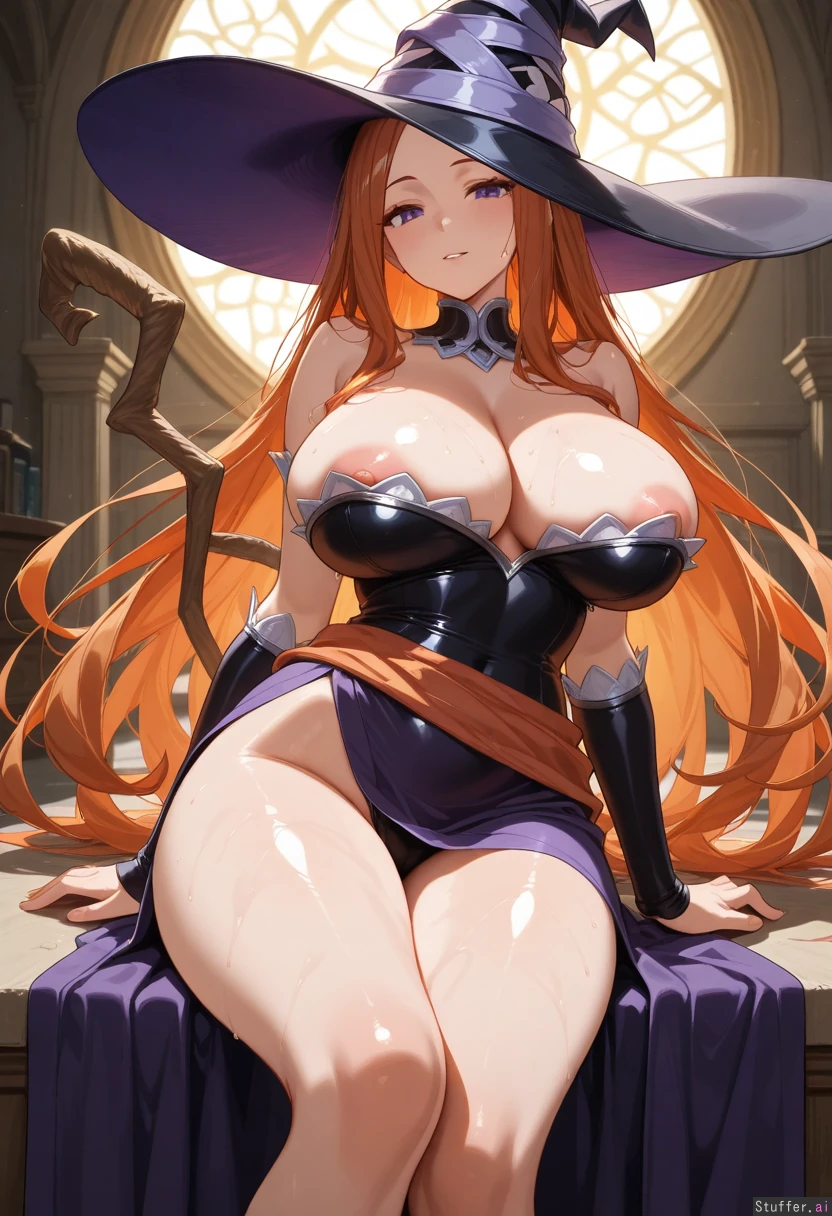 absurdres, 8k, perfect anatomy, masterpiece, beautiful face, beautiful eyes, 1girl, young (((sorceress_(dragon's_crown):1.2))) hyper_breasts, breasts_bigger_than_body, deep_cleavage, cleavage_overflow, nipple_slip, rod_between_legs, wet