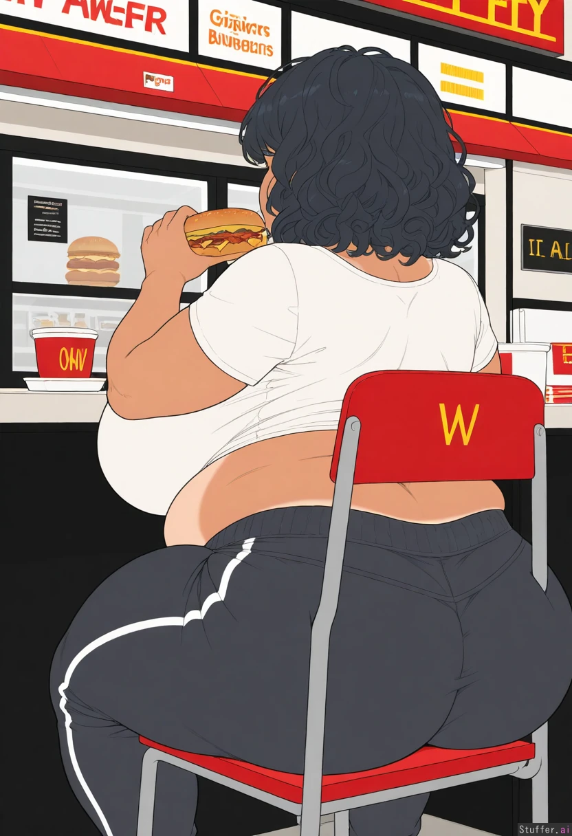 (High quality, flat color, simple shading, vivid details, from behind, 1girl) (Light brown skin, tan lines, black hair, tight curls, ripped clothes, bursting out of clothes, grey sweatpants, black pants, white blouse) ((Lower body only, sitting in chair, fast food restaurant , eating burgers, messy)) ((Athletic build, curvy)), thick, ((obese:1.0), big fat belly, fat rolls ((Gigantic breasts:1.0)) ((Wide hips:1.2)), (fat ass), (thick thighs)