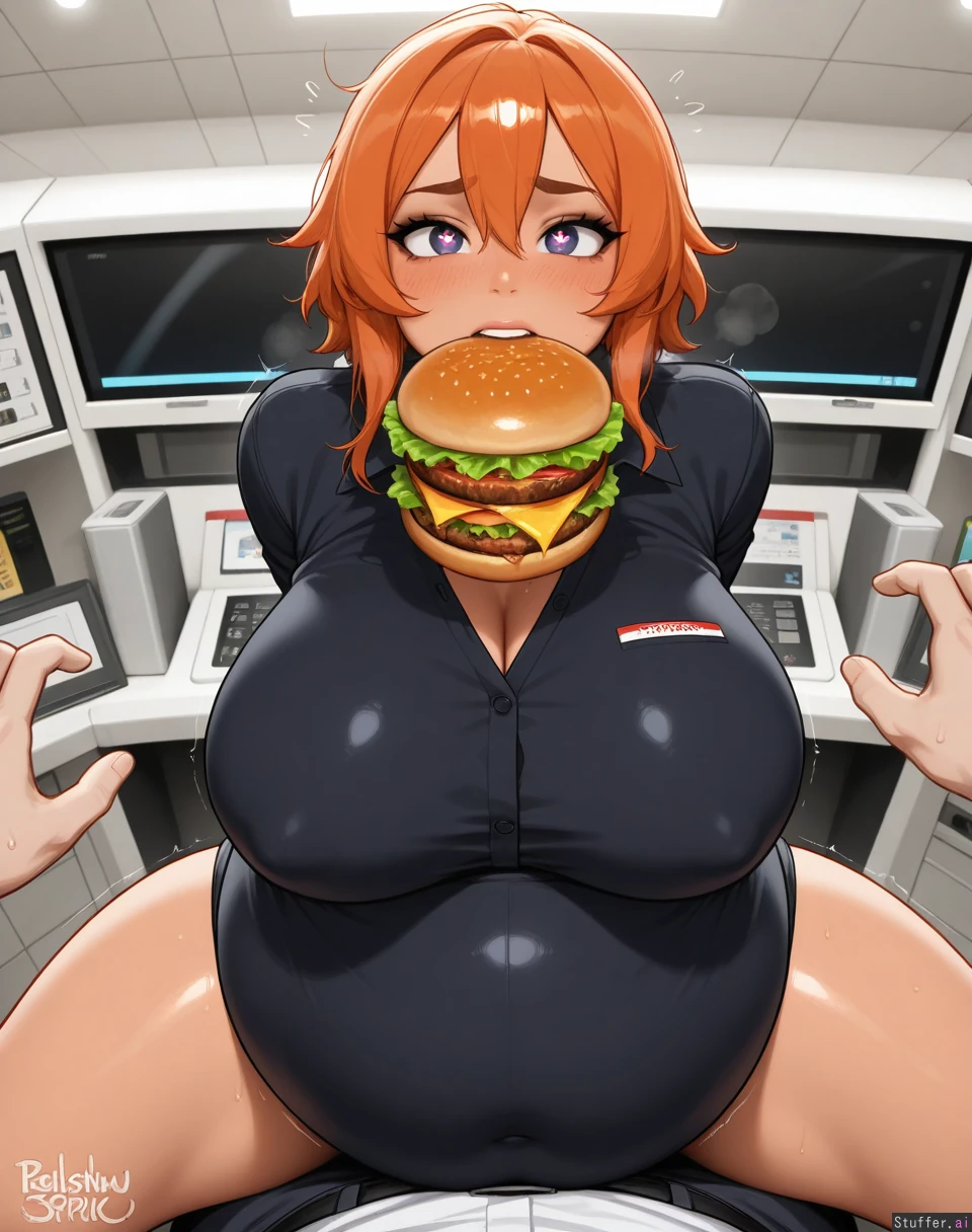 ((Ultra HD), (perfect lighting), realism), HDR, best quality, masterpiece, hyper detail, (wide view, one view, one angle, single scene), Absurdres, 8k, perfect anatomy, masterpiece, beautiful face, beautiful eyes, RockSolidArt. /(artist/), RockSolidArt(artist/) ,8), (merunyaa), (usa37107692:1.2), (ohasi_art), (betterwithsalt), (flat color:1.5) 1woman, gorgeous, beautiful, ((mature, milf)), dark burnt-orange hair:1.4, long bangs:1.4, sidecut:1.4, sideswept hair:1.4, blue-grey eyes, ((cashier outfit:1.4, cashier clothed:1.4, ill-fitting fast-food worker clothes:1.4, fully clothed:1.4)), (large perky breasts, pleasure) (very tall, curvy,) (thick thighs and wide hips:1.5, thick girl:1.2), (((hyper gigantic belly:1.3))) ((spherical belly:1.2)), gigantic ass:1.4, (gigantic hips:1.1) (gigantic thighs:1.1), narrow hips, athletic hips, huge hip dips:1.3, hyper thighs:1.3, round plump buttocks:1.4, sagging phat-ass:1.4, (Medium plump breasts:1.4), sagging breasts:1.4, droopy breasts:1.4, (breasts:1.4, natural breasts:1.4, plump-soft breasts:1.4, full_to_the_limit breasts:1.2)) ((desperately aroused:1.4, desperately horny:1.4, desperate pleading expression:1.4, open mouth heavy breathing, heavy panting, eyes rolled in orgasm)), Lustful, Seductive, (sexually submissive), ((sadistic expression)), ((deep blush)), ((horny)), ((tipsy)), (panting), (Sweating), (Exhausted), Bimbo, (hearts), ((trembling)), ((quivering)), (Tall woman), (Beautiful woman), (((Luscious lips))), (goth woman), ((Shiny skin)), ((skindentation)), ((thick thighs)), ((plump)), ((chubby_belly:1.3)), slim face, ((deep navel)), soft belly, (((love handles))), (((nervous))), ((eyes rolled back:0.3)), ((starry eyes)), ((star eyes)), ((belly hang:1.3)), ((stuffed belly:1.3)), ((gained weight:1.3)), ((body jiggle motions:1.7)), ((round belly)), ((bloated belly:1.3)), ((legs spread apart)), ((belly expansion:1.5)), (((force-feeding:1.3)), ((burger in mouth:1.4)), ((forced overeating:1.4)), ((man hand pushing burger in mouth:1.4))), ((hands tied behind her back)), ((growing belly:1.3)), ((tight belly)), ((overfed)), ((sagging belly:1.3)), ((begging for more:1.3)), ((Dazed:1.3)), ((intoxicated)), ((erect nipples)), ((gasping for air)), ((moaning)), ((food obsessed)), ((open mouth)), ((milf)), (heavy breathing), ((gyaru nails)), ((long nails)), (big eyes), ((drunk:1.7)), ((drooling:1.3)), ((tongue out:0.3)), ((glowing cheeks)), ((glowing cheeks)), ((ahegao:1.0)), ((slutty:1.3)), ((feeding fetish:1.3)), ((getting fat:1.7)), ((wide eyes:1.3)), ((shocked eyes:1.3)), ((aphrodisiac)), ((hearts:1.5)) c.cu(artist), kittew(artist), prywinko(artist), spellsx(artist), ohshinakai(artist), doveymouse(artist), Ninjart1st(artist), c.cu\(artist\):1.3), (blushyspicy\(artist\):1.2), (kipteitei\(artist\):1.2), (spellsX\(artist\):1.3), (Kittew\(artist\):1.3), (ohshinakai\(artist\):1.2), (doveymouse\(artist\):1.3), (Ninjart1st\(artist\):1.2), (Jellybelly\(artist\):1.3), (troat301186\(artist\):1.2), (toraraz\(artist\):1.3), ((highest resolution and clarity)), (perfect human anatomy), (high image clarity, sharp image focus), (4k_UHD, highly detailed, highest rating, high resolution, masterpiece quality, intricate texture detail, dynamic lighting), detailed face, best quality, masterpiece, (plump:1.5), (thick), (fat:1.2), massive belly, hdr, c.cu:1.2, blushyspicy:1.4, prywinko:1.4, betterwithsalt:1.2, icarusillustrations:1.4, Icarusillustrations:1.2, kittew:1.2, (spellsX\(artist\):1.3), (Coffeeslice\(artist\):1.3), (ohshinakai\(artist\):1.2), (doveymouse\(artist\):1.3), (((Super-lewd body:1.4))), (flat colors). ((white cutline-outline):1.3). masterful comic-book shading. masterpiece drawing. well-drawn lines. simple detailed eyes. pupils. gorgeous hair. beautiful woman. full lips. goblinhordestudios. kipteitei. pewbutt. betterwithsalt