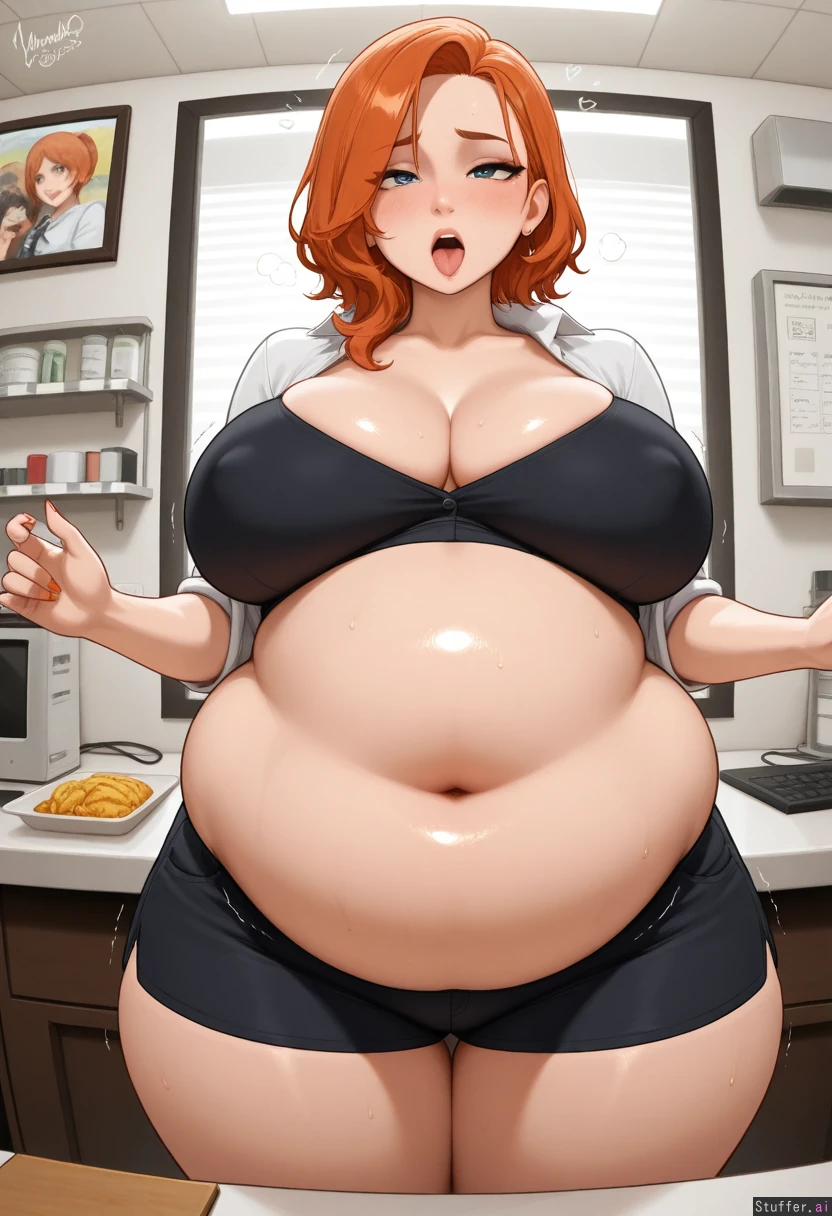 ((Ultra HD), (perfect lighting), realism), HDR, best quality, masterpiece, hyper detail, (wide view, one view, one angle, single scene), Absurdres, 8k, perfect anatomy, masterpiece, beautiful face, beautiful eyes, RockSolidArt. /(artist/), RockSolidArt(artist/) ,8), (merunyaa), (usa37107692:1.2), (ohasi_art), ((Icarusillustrations(artist):1.6)), (betterwithsalt), (flat color:1.5) 1woman, gorgeous, beautiful, ((mature, milf)), dark burnt-orange hair:1.4, long bangs:1.4, sidecut:1.4, sideswept hair:1.4, blue-grey eyes, ((cashier outfit:1.4, cashier clothed:1.4, ill-fitting fast-food worker clothes:1.4, fully clothed:1.4, standing behind register)), (large perky breasts, pleasure) (very tall, curvy,) (thick thighs and wide hips:1.5, thick girl:1.2), (((hyper gigantic belly:1.4))) ((spherical belly:1.3, super chubby-plump sagging-overweight:1.4)), gigantic ass:1.4, (gigantic hips:1.1) (gigantic thighs:1.1), narrow hips, athletic hips, huge hip dips:1.3, hyper thighs:1.3, round plump buttocks:1.4, sagging phat-ass:1.4, (Medium plump breasts:1.4), sagging breasts:1.4, droopy breasts:1.4, (breasts:1.4, natural breasts:1.4, plump-soft breasts:1.4, full_to_the_limit breasts:1.2)) ((desperately aroused:1.4, desperately horny:1.4, desperate pleading expression:1.4, open mouth heavy breathing, heavy panting, eyes rolled in orgasm)), Lustful, Seductive, (sexually submissive), ((sadistic expression)), ((deep blush)), ((horny)), ((tipsy)), (panting), (Sweating), (Exhausted), Bimbo, (hearts), ((trembling)), ((quivering)), (Tall woman), (Beautiful woman), (((Luscious lips))), (goth woman), ((Shiny skin)), ((skindentation)), ((thick thighs)), ((plump)), ((chubby_belly:1.3)), slim face, ((deep navel)), soft belly, (((love handles))), (((nervous))), ((eyes rolled back:0.3)), ((starry eyes)), ((star eyes)), ((belly hang:1.4)), ((stuffed belly:1.3)), ((gained weight:1.4)), ((body jiggle motions:1.4)), ((round belly)), ((bloated belly:1.4)), ((belly expansion:1.5)), ((growing belly:1.4)), ((tight belly)), ((overfed)), ((sagging belly:1.4)), ((begging for more:1.4)), ((Dazed:1.3)), ((intoxicated)), ((erect nipples)), ((gasping for air)), ((moaning)), ((food obsessed)), ((open mouth)), ((milf)), (heavy breathing), ((gyaru nails)), ((long nails)), (big eyes), ((drunk:1.4)), ((drooling:1.3)), ((tongue out:0.3)), ((glowing cheeks)), ((glowing cheeks)), ((ahegao:1.0)), ((slutty:1.3)), ((feeding fetish:1.3)), ((getting fat:1.4)), ((wide eyes:1.3)), ((shocked eyes:1.3)), ((aphrodisiac)), ((hearts:1.5)) c.cu(artist), kittew(artist), prywinko(artist), spellsx(artist), ohshinakai(artist), doveymouse(artist), Ninjart1st(artist), c.cu\(artist\):1.3), (blushyspicy\(artist\):1.2), (kipteitei\(artist\):1.2), (spellsX\(artist\):1.3), (Kittew\(artist\):1.3), (ohshinakai\(artist\):1.2), (doveymouse\(artist\):1.3), (Ninjart1st\(artist\):1.2), (Jellybelly\(artist\):1.3), (troat301186\(artist\):1.2), (toraraz\(artist\):1.3), ((highest resolution and clarity)), (perfect human anatomy), (high image clarity, sharp image focus), (4k_UHD, highly detailed, highest rating, high resolution, masterpiece quality, intricate texture detail, dynamic lighting), detailed face, best quality, masterpiece, (plump:1.5), (thick), (fat:1.2), massive belly, hdr, c.cu:1.2, blushyspicy:1.4, prywinko:1.4, betterwithsalt:1.2, icarusillustrations:1.4, Icarusillustrations:1.2, kittew:1.2, (spellsX\(artist\):1.3), (Coffeeslice\(artist\):1.3), (ohshinakai\(artist\):1.2), (doveymouse\(artist\):1.3), (((Super-lewd body:1.4))), (flat colors). ((white cutline-outline):1.3). masterful comic-book shading. masterpiece drawing. well-drawn lines. simple detailed eyes. pupils. gorgeous hair. beautiful woman. full lips. goblinhordestudios. kipteitei. pewbutt. betterwithsalt