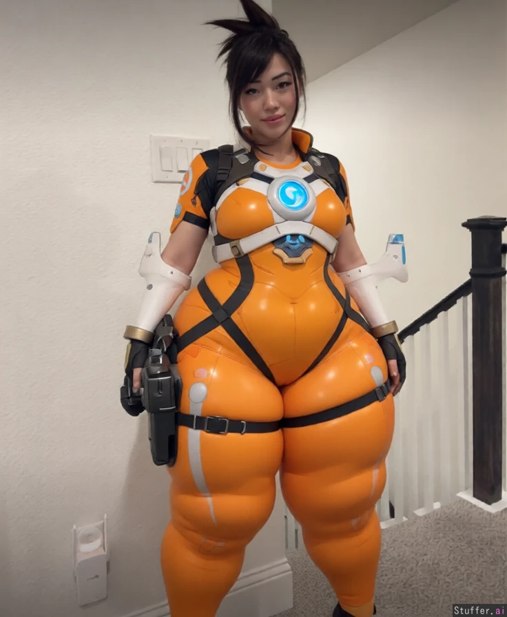 give her a extremely blob, extremely blob legs and calf, extremely slim waist, cosplay of tracer from overwatch