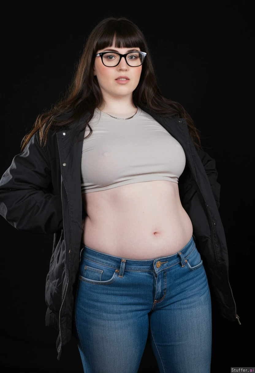 (trans woman:1.7), (feminine trait:1.2), (square jaw:1.4) (skinny body:1.2), (wide breast:0.5), (slim waist:1.5), (skinny belly:1.4), (huge body:0.5) (long black messy hair with bangs:1.5), dressed (thick, fitted grey t-shirt:1.4), (blue jeans:1.6), (long black full fur jacket:1.5), (Large square glasses:1.4), large silver necklace (pale skin:1.5), (standing upright:1.5) black background, the light from above greatly darkens the features, almost no light, in the shadow