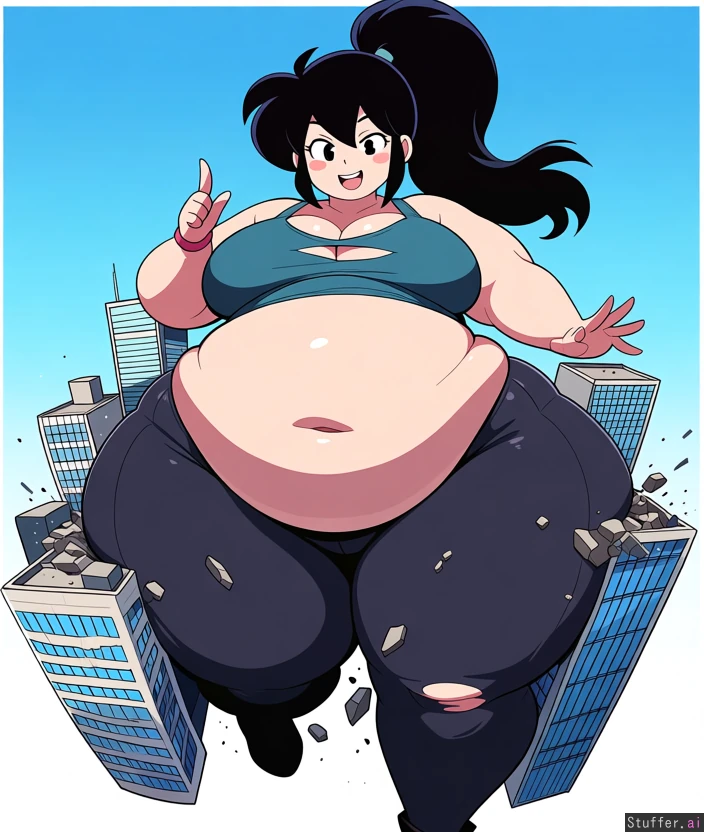 anime, cute face, nerdy, ssbbw, fat giantess, walking through buildings, coming towards the viewer, in city, giantess squished in between buildings, (buildings breaking against belly and ass), belly and ass smothering buildings (giantess is crushing buildings with her belly and ass), black hair, ponytail, ripped tank top, torn leggings, soft belly, massive belly, flirty, playful, massive ass, wide ass, wide hips, humongous thighs, buildings destroyed by giantess, rubble, city destruction, clear sky background