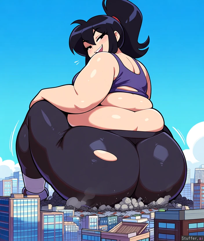 anime, cute face, nerdy, ssbbw, fat giantess, sitting on buildings (buildings are destroyed underneath ass), in city, giantess squished in between buildings, (buildings breaking against belly and ass), belly and ass smothering buildings (giantess is crushing buildings under her ass), black hair, ponytail, ripped tank top, torn leggings, soft belly, massive belly, flirty, playful, massive ass, wide ass, wide hips, humongous thighs, buildings destroyed by giantess, rubble, city destruction, clear sky background