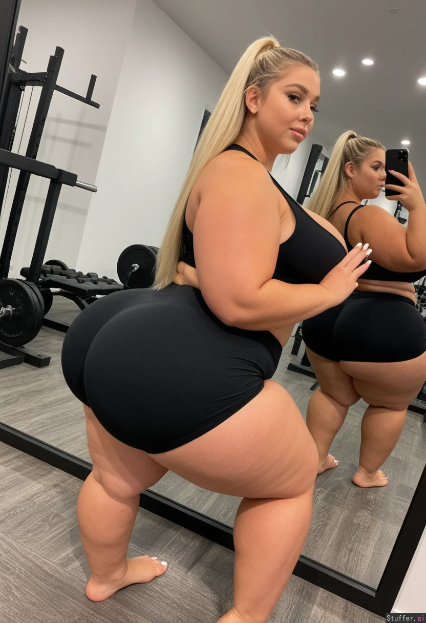 1 white American, Caucasian tan skin, lazy, bright light long blonde hair, elegant hair, 20 years old, gorgeous face, (perfect natural breasts:1.6), looking at viewer, blue eyes, defined jawline, beautiful influencer, ((thick thighs:1.8)) ((Big belly:1.5)) ((perfect curve fitting black workout set, fully clothed:1.8)) ((Huge pushed up cleavage:1.8)) (Enormous ultra wide overflowing hips:1.9), (Thick plump butt:1.8), ((taking sexy mirror selfie):1.9), (view from back, butt view:1.8), ((fat gigantic soft flabby chubby arms:1.9)) , ((white toenails:1.7)), ((hyper realism)), ((huge ass:2.0))