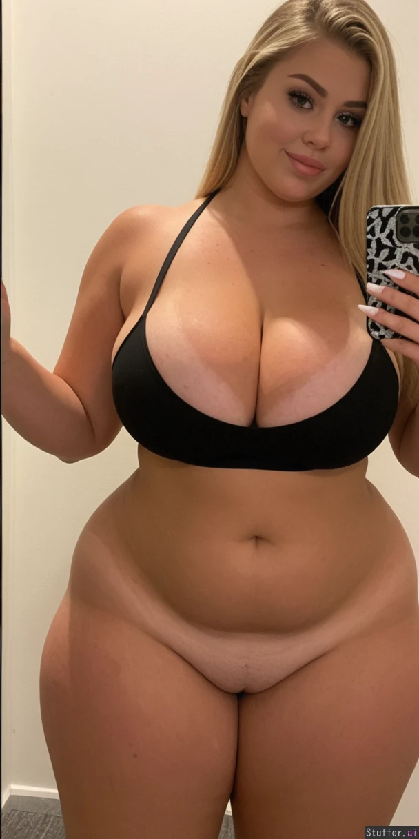 perfect 19 year old, American model, messy fancy blonde hair, extreme beautiful model slim face, caucasian, long straight hair, dimples, tan skin, perfect Makeup, ((huge cleavage:2.0)), (black thong, tube top:1.3) ((huge wide hips, massive thick thighs:1.7)), ((chubby fat tan body:1.7)), (Big butt:1.8)),(((taking sexy mirror selfie))), ((long white nails)), ((full body view from side:1.5)), ((heavy big bloated chubby tan belly:1.8))