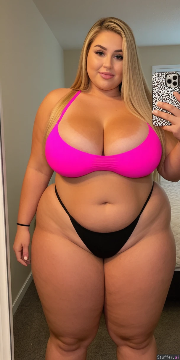 perfect 19 year old, American model, messy fancy blonde hair, extreme beautiful model round chubby face, caucasian, long straight hair, dimples, tan skin, perfect Makeup, ((huge cleavage:2.0)), (black thong, tube top:1.3) ((huge wide hips, massive thick thighs:1.7)), ((chubby fat tan body:1.7)), (Big butt:1.8)),(((taking sexy mirror selfie))), ((long white toenails)), ((full body view from side:1.7)), ((heavy big bloated chubby tan belly:1.8))