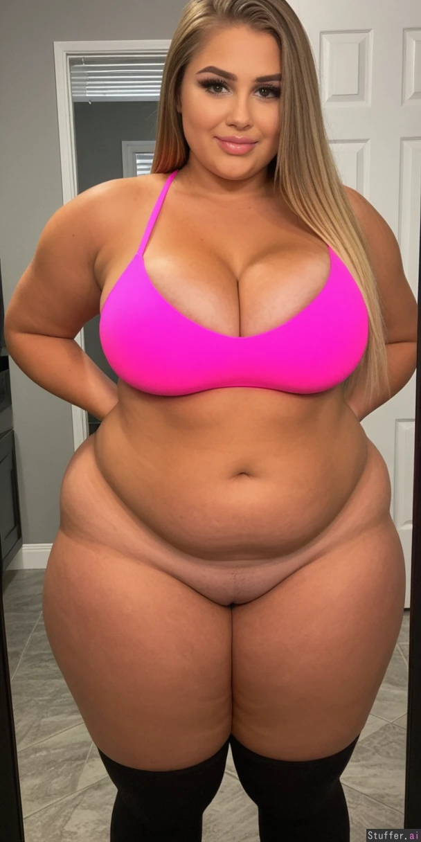 perfect 19 year old, American model, messy fancy blonde hair, extreme beautiful model round chubby face, caucasian, long straight hair, dimples, tan skin, perfect Makeup, ((huge cleavage:2.0)), (black leggings, tube top:1.3) ((huge wide hips, massive thick thighs:1.7)), ((chubby fat tan body:1.7)), (Big butt:1.8)),(((taking sexy mirror selfie))), ((long white toenails)), ((full body view from side:1.7)), ((heavy big bloated chubby tan belly:1.8))
