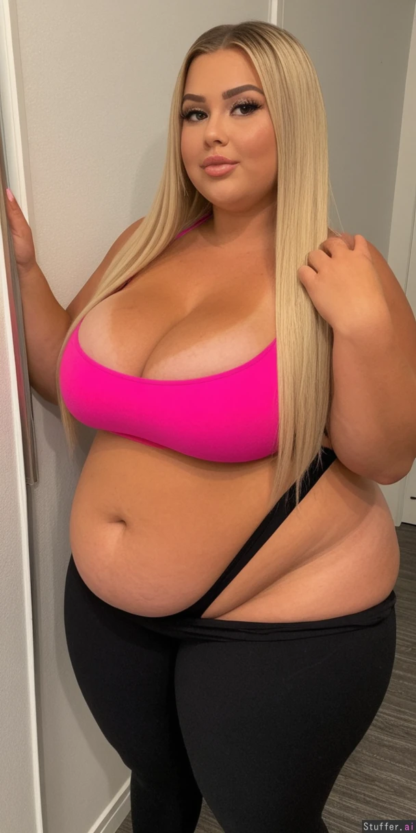 perfect 19 year old, American model, messy fancy blonde hair, extreme beautiful model round chubby face, caucasian, long straight hair, dimples, tan skin, perfect Makeup, ((huge cleavage:2.0)), (black leggings, tube top, fully clothed:1.6) ((huge wide hips, massive thick thighs:1.7)), ((chubby fat tan body:1.7)), (Big butt:1.8)),(((taking sexy mirror selfie))), ((long white toenails)), ((full body view from side:1.7)), ((heavy big bloated chubby tan belly:1.8))