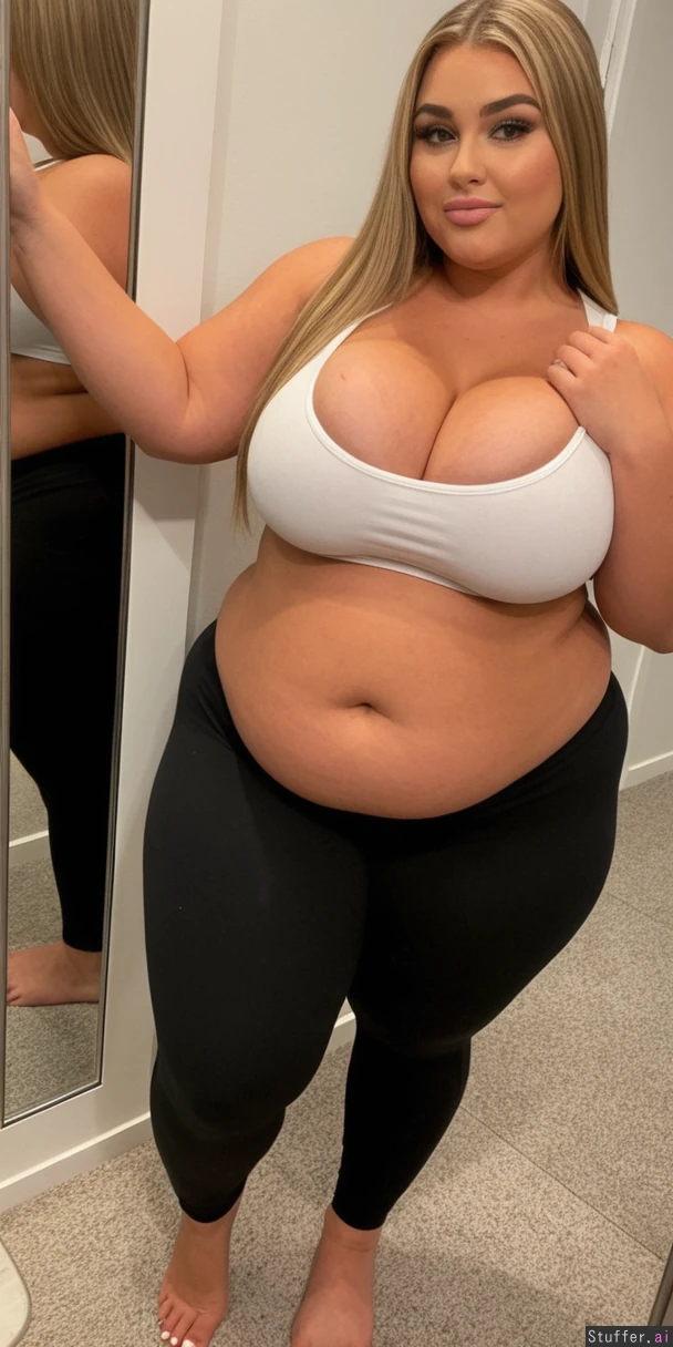 perfect 19 year old, American model, messy fancy blonde hair, extreme beautiful model round chubby face, caucasian, long straight hair, dimples, tan skin, perfect Makeup, ((huge cleavage:2.0)), (black leggings, tube top, fully clothed:1.6) ((huge wide hips, massive thick thighs:1.7)), ((chubby fat tan body:1.7)), (Big butt:1.8)),(((taking sexy mirror selfie))), ((long white toenails)), ((full body view from side:1.7)), ((heavy big bloated chubby tan belly:1.8))