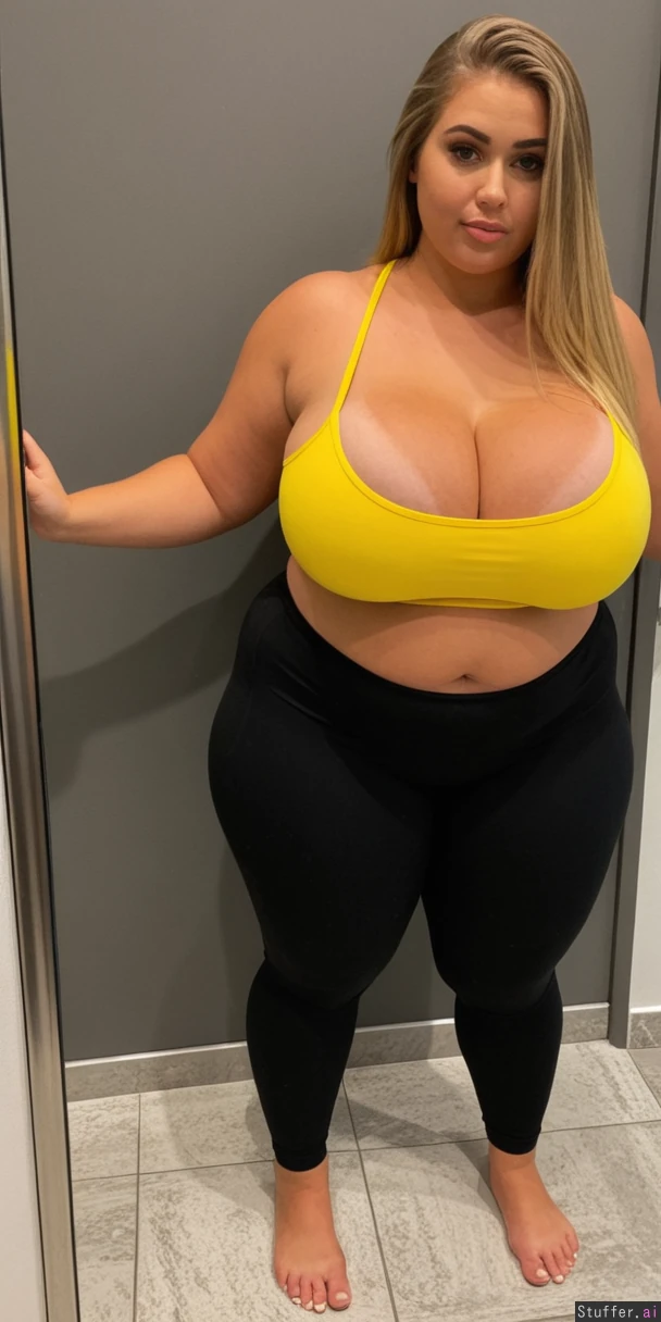 perfect 19 year old, American model, messy fancy blonde hair, extreme beautiful model round chubby face, caucasian, long straight hair, dimples, tan skin, perfect Makeup, ((huge cleavage:2.0)), (black leggings, tube top, fully clothed:1.6) ((huge wide hips, massive thick thighs:1.7)), ((chubby fat tan body:1.7)), (Big butt:1.8)),(((taking sexy mirror selfie))), ((long white toenails)), ((full body view from side:1.7)), ((heavy big bloated chubby tan belly:1.8))