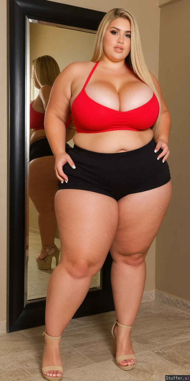 perfect 19 year old, American model, messy fancy blonde hair, extreme beautiful model round chubby face, caucasian, long straight hair, dimples, tan skin, perfect Makeup, ((huge cleavage:2.0)), (black shorts, tube top, heels, fully clothed:1.6) ((huge wide hips, massive thick thighs:1.8)), ((chubby fat tan body:1.7)), (Big butt:1.8)),(((taking sexy mirror selfie))), ((long white toenails:1.7)), ((full body view from side:1.7)), ((heavy big bloated chubby tan belly:1.8)), luxurious vibe, necklace and jewelry