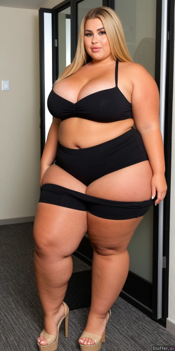 perfect 19 year old, American model, messy fancy blonde hair, extreme beautiful model round chubby face, caucasian, long straight hair, dimples, tan skin, perfect Makeup, ((huge cleavage:2.0)), (black shorts, tube top, heels, fully clothed:1.6) ((huge wide hips, massive thick thighs:1.8)), ((chubby fat tan body:1.7)), (Big butt:1.8)),(((taking sexy mirror selfie))), ((long white toenails:1.7)), ((full body view from side:1.7)), ((heavy big bloated chubby tan belly:1.8)), luxurious vibe, necklace and jewelry