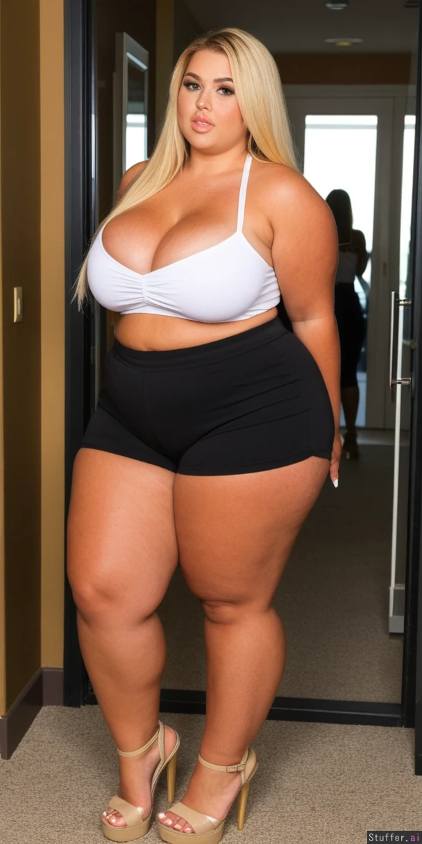 perfect 19 year old, American model, messy fancy blonde hair, extreme beautiful model round chubby face, caucasian, long straight hair, dimples, tan skin, perfect Makeup, ((huge cleavage:2.0)), (black shorts, tube top, heels, fully clothed:1.6) ((huge wide hips, massive thick thighs:1.8)), ((chubby fat tan body:1.7)), (Big butt:1.8)),(((taking sexy mirror selfie))), ((long white toenails:1.7)), ((full body view from side:1.7)), ((heavy big bloated chubby tan belly:1.8)), luxurious vibe, necklace and jewelry