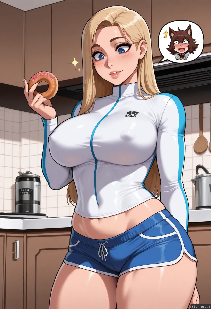 (nyantcha:1.2), (krekkov:1.4), (reiq:1.1), (kittew:1.2), 8k, high resolution, maximum pixel density, masterpiece, (((highly detailed))), ((flawless)), (((high rating))), ((highly detailed face)), full resolution, 8k, high resolution, best quality, Appearance: Long straight blonde hair, beautiful, sparkling blue eyes, starry pupils, tan skin, freckles, blushing heavily, mischievous eyes, anime-woman, shocked expression, embarrassed, (erect nipples), tall Outfit: tight crop top, jean shorts Location: Standing, posing in kitchen, donut in hand, side-view, looking down at self, lounging, Modifiers: (Skinny body:1.7), (larger breasts:0.8), (morbidly obese ssbbw:0.5), (fat heavy belly:0.5),