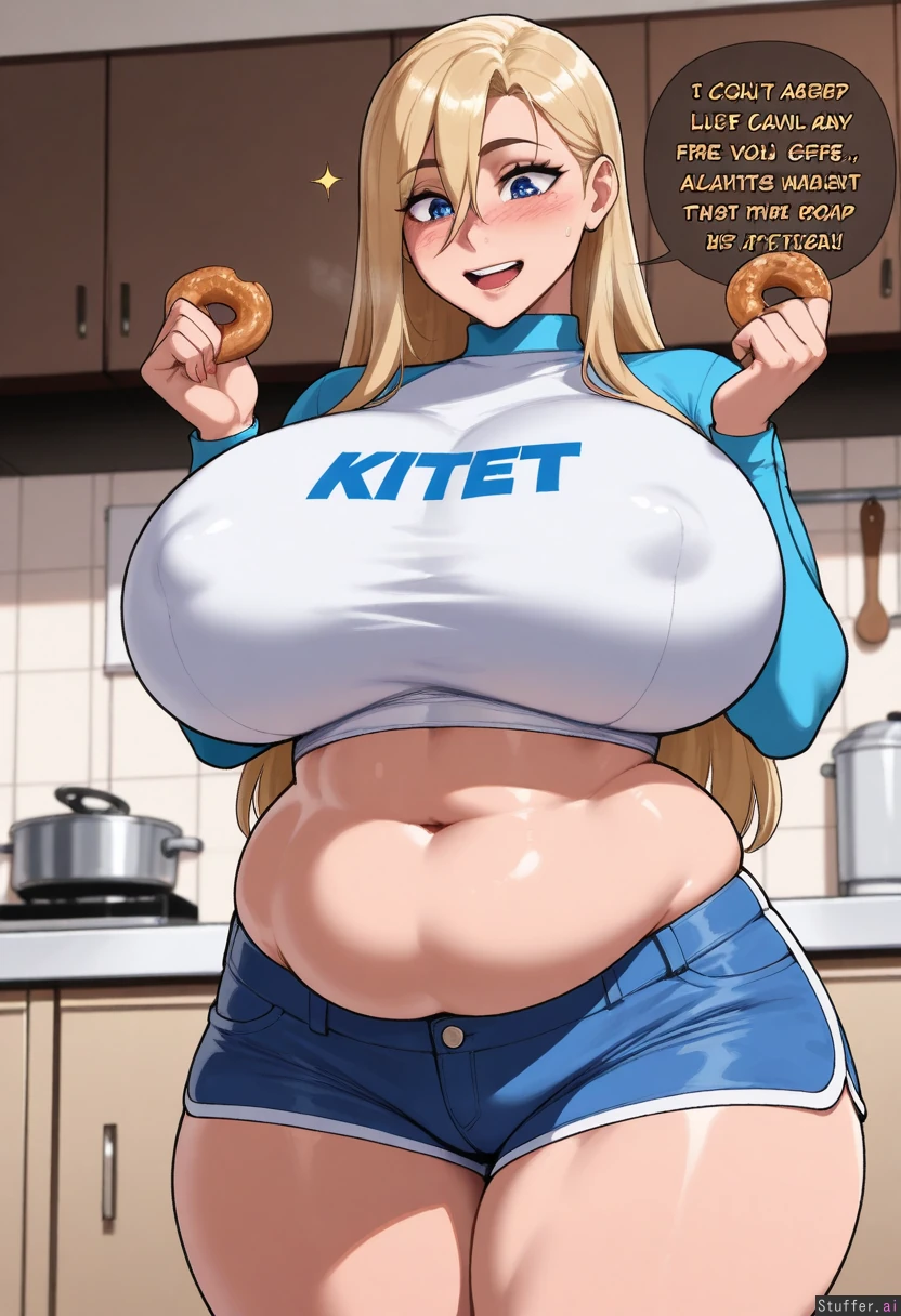 (nyantcha:1.2), (krekkov:1.4), (reiq:1.1), (kittew:1.2), 8k, high resolution, maximum pixel density, masterpiece, (((highly detailed))), ((flawless)), (((high rating))), ((highly detailed face)), full resolution, 8k, high resolution, best quality, Appearance: Long straight blonde hair, beautiful, sparkling blue eyes, starry pupils, tan skin, freckles, blushing heavily, mischievous eyes, anime-woman, shocked expression, embarrassed, (erect nipples), tall Outfit: tight crop top, jean shorts Location: Standing, posing in kitchen, donut in hand, side-view, looking down at self, lounging, Modifiers: (Skinny body:1.55), (gigantic breasts:1.05), (morbidly obese ssbbw:1.0), (fat heavy belly:1.0),