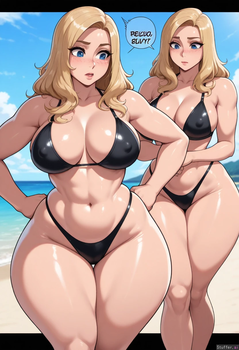 (nyantcha:1.2), (krekkov:1.4), (reiq:1.1), (kittew:1.2), 8k, high resolution, maximum pixel density, masterpiece, (((highly detailed))), ((flawless)), (((high rating))), ((highly detailed face)), full resolution, 8k, high resolution, best quality, nsfw, solo straight blonde hair, beautiful, blue eyes, starry pupils, tan skin, freckles, blushing, mischievous eyes, anime-woman, shocked expression, embarrassed, (erect nipples), Tight bikini Standing, posing at beach, side-view, looking down at self, hands on hips, (Slim body:1.9), (medium breasts,1.0), (skinny figure:1.0)