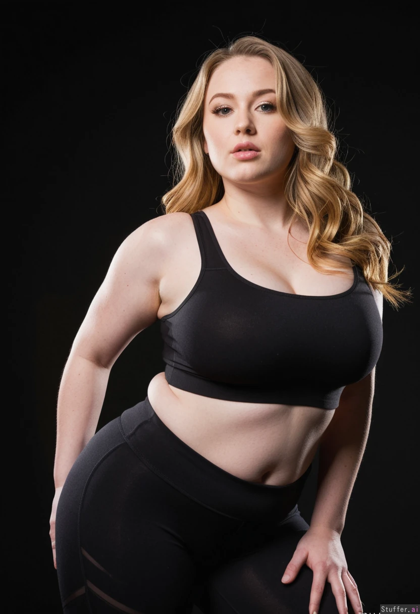 { "prompt": "Ultra photorealistic, 8k detailed close-up to medium portrait of a seductive curvy Caucasian blonde woman with long wavy golden blonde hair, soft voluptuous figure, noticeably rounded soft belly visibly spilling over and muffin-topping the extremely tight high-waisted black yoga pants waistband, full round prominent breasts strongly accentuated by tight sports bra, wide voluptuous hips noticeably broader than her shoulders creating an extreme hourglass silhouette, thick powerful thighs. She has a soft emerging double chin adding to her natural fullness, wearing only skintight black sports bra that pushes up and squeezes her chest creating deep cleavage with visible fabric stretch, and skintight high-waisted black yoga pants that cling relentlessly to every curve with extreme tension lines, slight transparency on stretched areas over hips and thighs. Posing confidently and seductively standing or slightly leaning forward in a pure professional photography studio, intense direct eye contact with the viewer, slightly parted glossy lips, professional studio lighting: soft large key light from front-left, strong dramatic rim light from behind for edge separation, subtle fill light to softly lift shadows under chin and body, clean plain dark gray or black seamless background with no distractions, highly detailed realistic skin texture with visible pores, subtle imperfections, natural skin sheen and soft highlights, ultra sharp focus on face (including emerging double chin), fabric details, body contours, cinematic intimate mood, razor sharp, hyper photorealistic", "parameters": { "style": "ultra photorealistic, cinematic portrait photography", "hair": "long wavy golden blonde, cascading naturally over shoulders", "face_features": { "expression": "intense seductive gaze, confident, alluring", "chin": "soft emerging double chin, natural fullness starting under jawline" }, "body_proportions": { "shoulders": "relatively narrower", "hips": "very wide voluptuous, noticeably broader than shoulders", "belly": "soft, rounded, prominently spilling over and muffin-topping tight waistband, visible overhang", "breasts": "full, round, prominent, heavily pushed up and squeezed", "thighs": "thick, powerful, pants clinging tightly" }, "clothing_details": [ "skintight black sports bra, ultra compressive fit, strong lift and cleavage emphasis, visible stretch marks/tension", "skintight high-waisted black yoga pants, extremely tight, waistband digging in, clear belly spillover and muffin top, extreme fabric stretch over wide hips and thick thighs" ], "pose": "standing confidently facing camera or slight 3/4 turn, seductive powerful stance, hands on wide hips or one hand lightly touching neck/hair, body slightly arched to emphasize curves and hip width", "lighting": "professional studio: soft key light (large softbox front-left), strong rim/backlight for dramatic separation and glow on hair/curves, subtle fill to softly illuminate under-chin area without flattening double chin", "mood": "sensual, bold, empowering, intimate close-up atmosphere", "environment": "minimalist professional photography studio, plain seamless dark background (no objects, pure clean void-like backdrop)", "camera": "medium close-up to upper-body portrait, shallow depth of field f/1.4f/2 style, ultra sharp focus throughout subject" } }