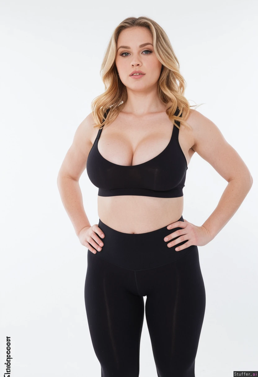 { "prompt": "Ultra photorealistic, 8k detailed full body square portrait of a seductive curvy Caucasian blonde woman with long wavy golden blonde hair, soft voluptuous figure, prominently rounded soft belly visibly spilling over and muffin-topping the extremely tight high-waisted black yoga pants waistband creating clear overhang and soft roll, full round prominent breasts strongly accentuated and lifted by tight sports bra with deep cleavage, very wide voluptuous hips noticeably broader than her shoulders for extreme hourglass shape, thick powerful thighs. She has a soft emerging double chin adding natural fullness to her face. Wearing only skintight black sports bra that clings ultra tight pushing up her chest with visible fabric stretch and tension, and skintight high-waisted black yoga pants that hug every curve relentlessly with extreme stretch lines, slight sheen and transparency on stretched areas over hips and thighs. Standing confidently straight-on facing the camera fully frontal, feet shoulder-width apart, hands relaxed on wide hips or lightly at sides, seductive powerful stance with slight arch in back to emphasize belly and curves, intense direct eye contact, slightly parted glossy lips, professional bright high-key studio lighting: multiple large softbox key lights from front and sides for even bright illumination with minimal soft shadows, subtle rim light for gentle separation without darkness, clean plain white seamless background, no distractions or props, highly detailed realistic skin texture with pores, natural sheen and subtle highlights, ultra sharp focus from head to toe on face, emerging double chin, prominent belly spillover, fabric details and body contours, bright empowering cinematic mood, razor sharp, hyper photorealistic", "parameters": { "style": "ultra photorealistic, high-key studio portrait photography", "format": "square full body composition", "lighting": "bright high-key professional studio, multiple large softboxes for even bright wash, minimal soft shadows, no dramatic dark areas, clean and airy atmosphere", "hair": "long wavy golden blonde, cascading naturally over shoulders", "face_features": { "expression": "intense seductive gaze straight to camera, confident, alluring", "chin": "soft emerging double chin, natural subtle fullness under jawline" }, "body_proportions": { "shoulders": "relatively narrower", "hips": "very wide voluptuous, noticeably broader than shoulders", "belly": "prominently soft and rounded, clear visible spillover over waistband, pronounced muffin top overhang and roll", "breasts": "full, round, prominent, heavily pushed up and squeezed by bra", "thighs": "thick, powerful, pants clinging tightly with visible tension" }, "clothing_details": [ "skintight black sports bra, ultra compressive, strong lift and cleavage, visible stretch and fabric pull", "skintight high-waisted black yoga pants, extremely tight, waistband digging in slightly, extreme belly spillover/muffin top, fabric stretched thin over wide hips and thick thighs with sheen" ], "pose": "standing straight-on frontal view facing camera directly, full body visible from head to feet, confident stance, hands on hips or relaxed at sides, body slightly arched to accentuate belly prominence and hip width", "mood": "sensual, bold, empowering, bright and inviting high-key atmosphere", "environment": "minimalist bright professional photography studio, plain seamless white background (pure clean bright void, no shadows or objects)", "camera": "full body square frame, medium distance, shallow to moderate depth of field, shot on high-end cinema camera style, ultra sharp focus throughout" } }