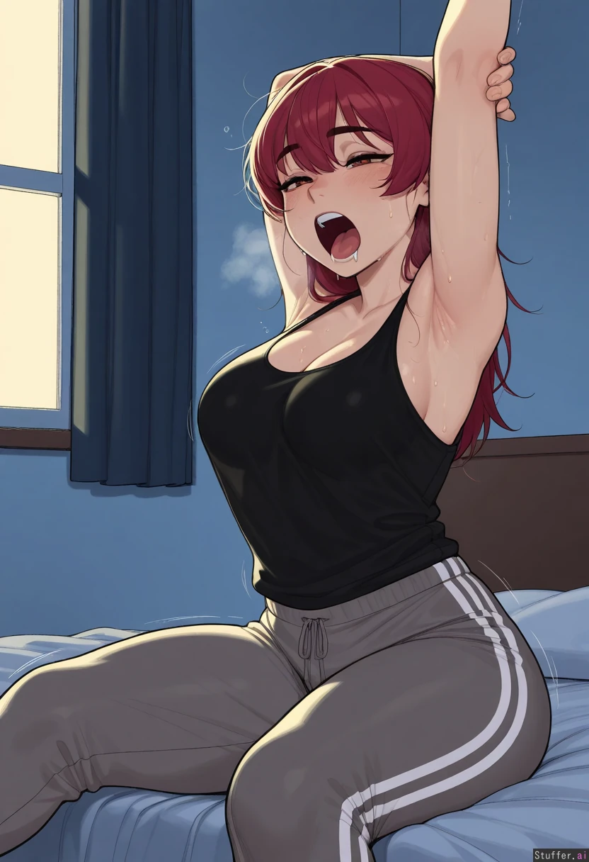 (highly detailed, best quality, masterpiece), (perfect anatomy, perfect proportions), (dim lighting, vibrant colors, perfect shading), (beautiful face, beautiful eyes), (Krekkov(artist), KAMII MOMORU(artist)), (one girl, solo), (bedroom, window, morning), (Houshou_marine), ((black tank top, gray pajama sweatpants), (((((sweating))))), (heavy breathing, aroused, half-closed eyes, drooling, medium breasts)), (soft belly, chubby belly, soft round hips, soft thighs, nervous, uncomfortable, weight gain:0.6) ((motion lines, sitting on bed, just waking up, stretching, arms over head, yawning))
