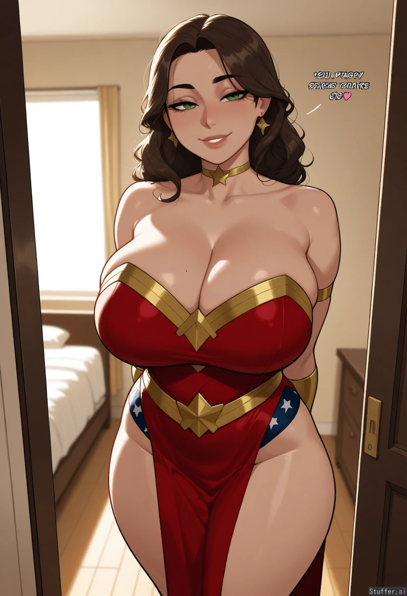 krekkov (artist), KAMII MOMORU(artist), KipTeiTei (artist) 1woman, mature woman, mature female, solo 27 years old Caucasian skin, brown hair, green eyes, pretty face Aroused, seductive smile wonder woman Shes standing in the middle of the room, hands behind her back Shes in a bedroom in a nice house, private room Day time, afternoon, soft lighting (Side view: 1.1)
