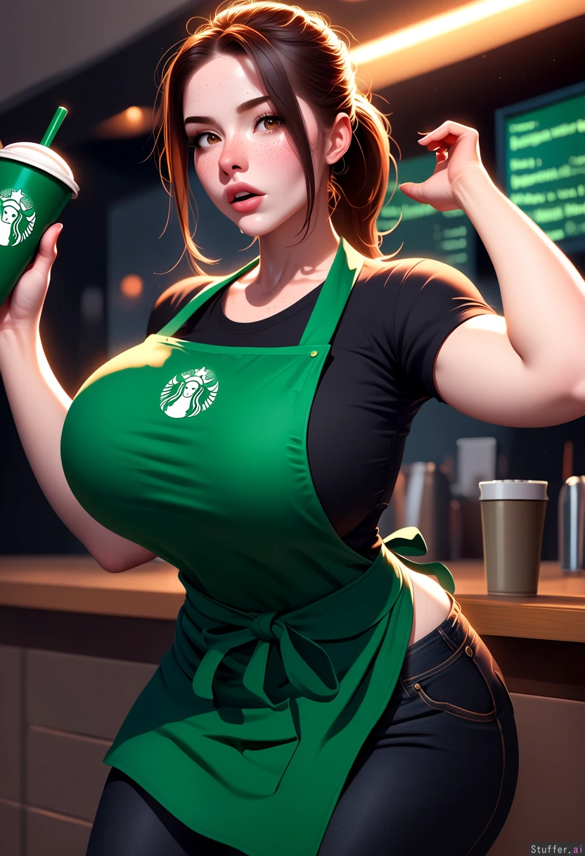 (masterpiece artwork, deviantart, high_resolution, professional_quality, best_rating, detailed female body, exceptional clarity, 3D_erotica, global_illumination, volumetric_lighting, blended_shading, sense of depth, sense of scale), highly realistic, beautiful, (fair pale skin), attractive face, slim face, voluptuous body, narrow shoulders, freckles, heavy , starbucks , 1girl , brown_hair , eyes brown, Green apron, black jeans, ponytail, (black t-shirt), She is surprised (Gigantic breast: 0.1), (gigantic ass: 0.1),