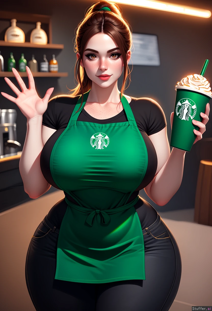 (masterpiece artwork, deviantart, high_resolution, professional_quality, best_rating, detailed female body, exceptional clarity, 3D_erotica, global_illumination, volumetric_lighting, blended_shading, sense of depth, sense of scale), highly realistic, beautiful, (fair pale skin), attractive face, slim face, voluptuous body, narrow shoulders, freckles, heavy , starbucks , 1girl , brown_hair , eyes brown, Green apron, black jeans, ponytail, (black t-shirt), She waving (Gigantic breast: 0.1), (gigantic ass: 0.1),