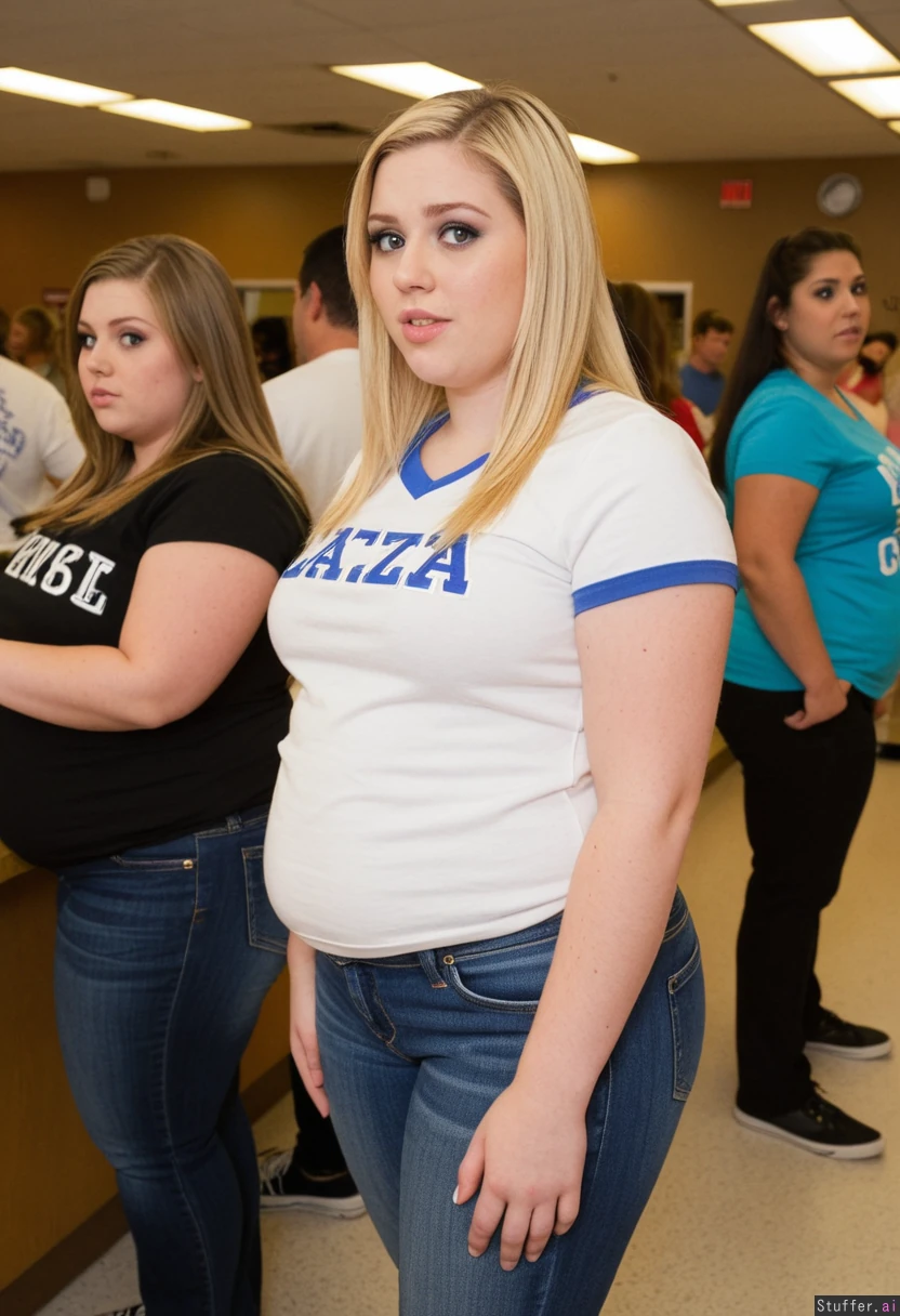 Blonde, 22, dense, plump, white girl, hazel eyes, wide jaw, sorority shirt, jeans. Standing in line at the cafeteria. Embarrassed to be fat.