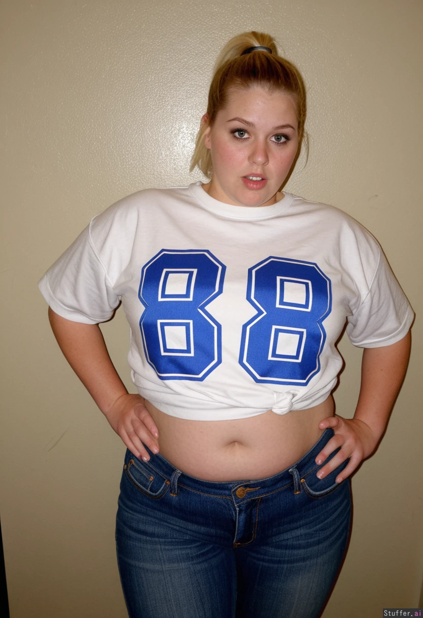 Blonde, 22, dense, plump, white girl, hazel eyes, wide jaw, oversized sorority shirt, jeans. Embarrassed to be fat. Overgrown. Candid pic. Wide body, wide hips. Ponytail.