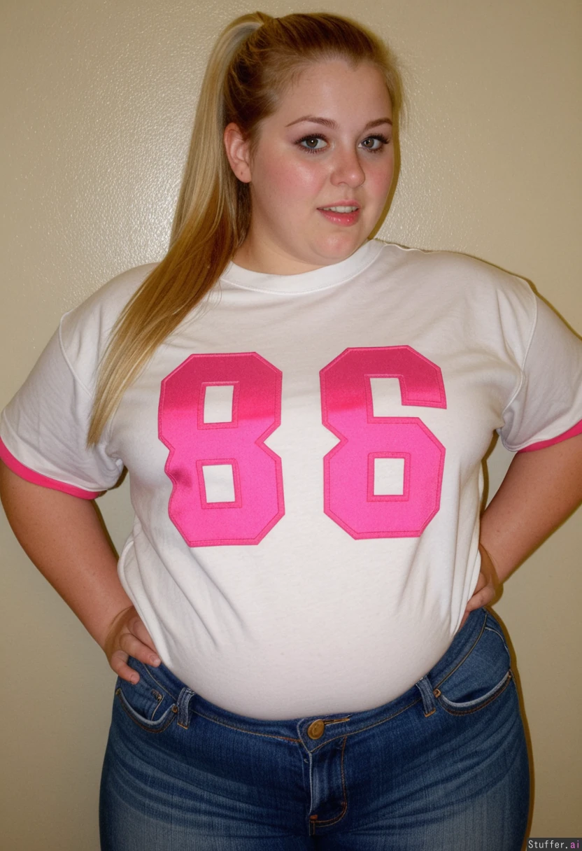 Blonde, 22, dense, plump, white girl, hazel eyes, wide jaw, oversized sorority shirt, jeans. Embarrassed to be fat. Overgrown. Candid pic. Wide body, wide hips. Ponytail.