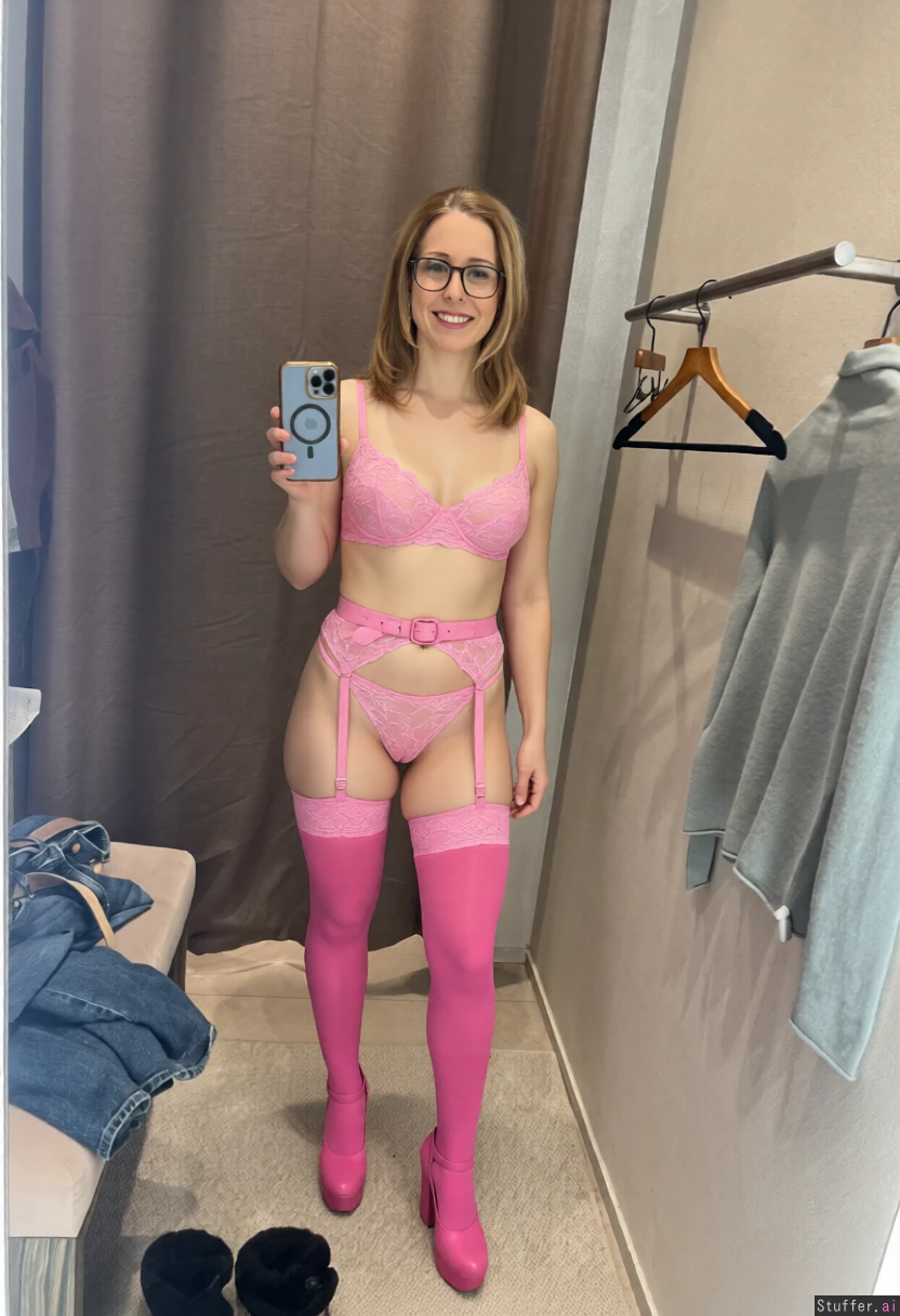 ((swap clothes for pink lace lingerie, matching garter_belt and garter_straps, pink thighhighs, very cute platform_heels)), genuine smile,