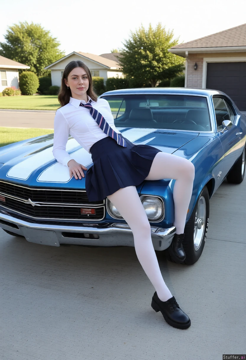 full_body, change venue to suburban driveway, ((swap clothes, opaque white tights, pleated skirt, buttondown shirt, tie)), reclining on the hood of a 1970s American muscle car,
