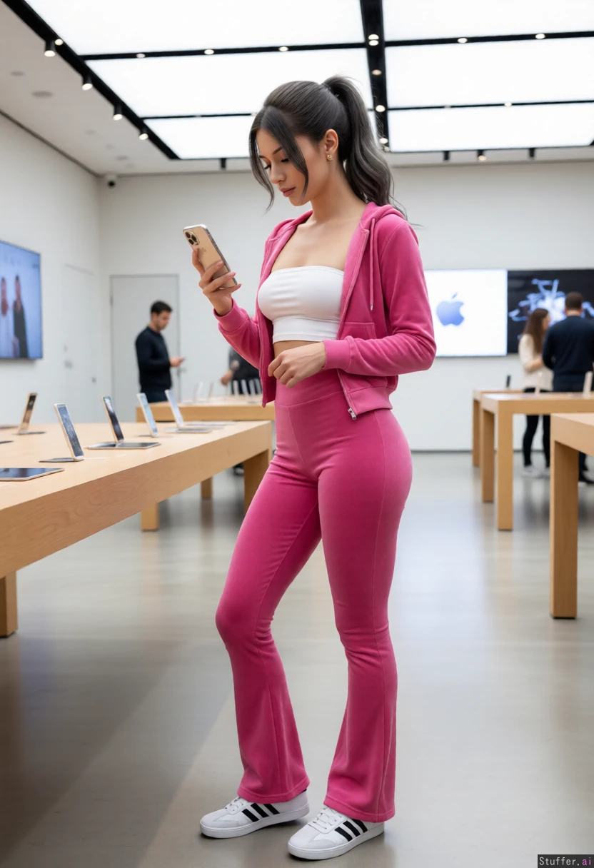 ((swap clothes to pink velour tracksuit, pants are tight in hip and bum with flared cuffs, white tube_top under open crop_top hoodie, white adidas sneakers)), looking at the new iPhone in the Apple store, a well lit modern minimalist retail environment,