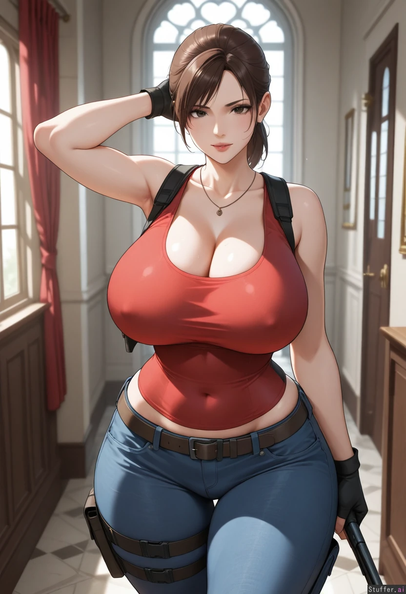 masterpiece artwork, 4K_resolution, ultra_quality, maximum_rating, detailed female body, impeccable clarity, diffused gloomy light, sense of depth, sense of scale, (Claire_Redfield, Resident_Evil), confident, bratty, attractive, sensual, virgin, fertile, lush, gluttonous, aroused, haunted_mansion, posing, (((irresistible curvy voluptuous physique))), ((wide hips, thick gluteal mass)), (clothed),